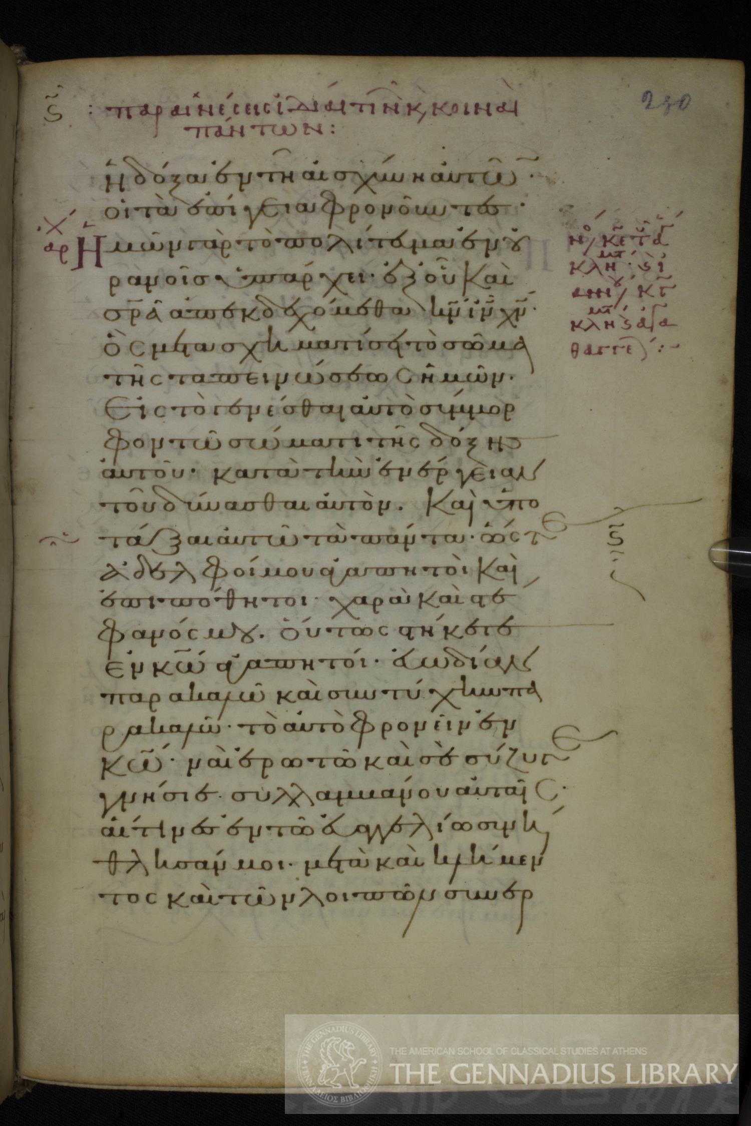 Thirteenth century manuscript of Apostolos and Pauline Epistles on parchment; 379 leaves, 1 column, 23 lines per column. For more information, please visit Gennadius Library