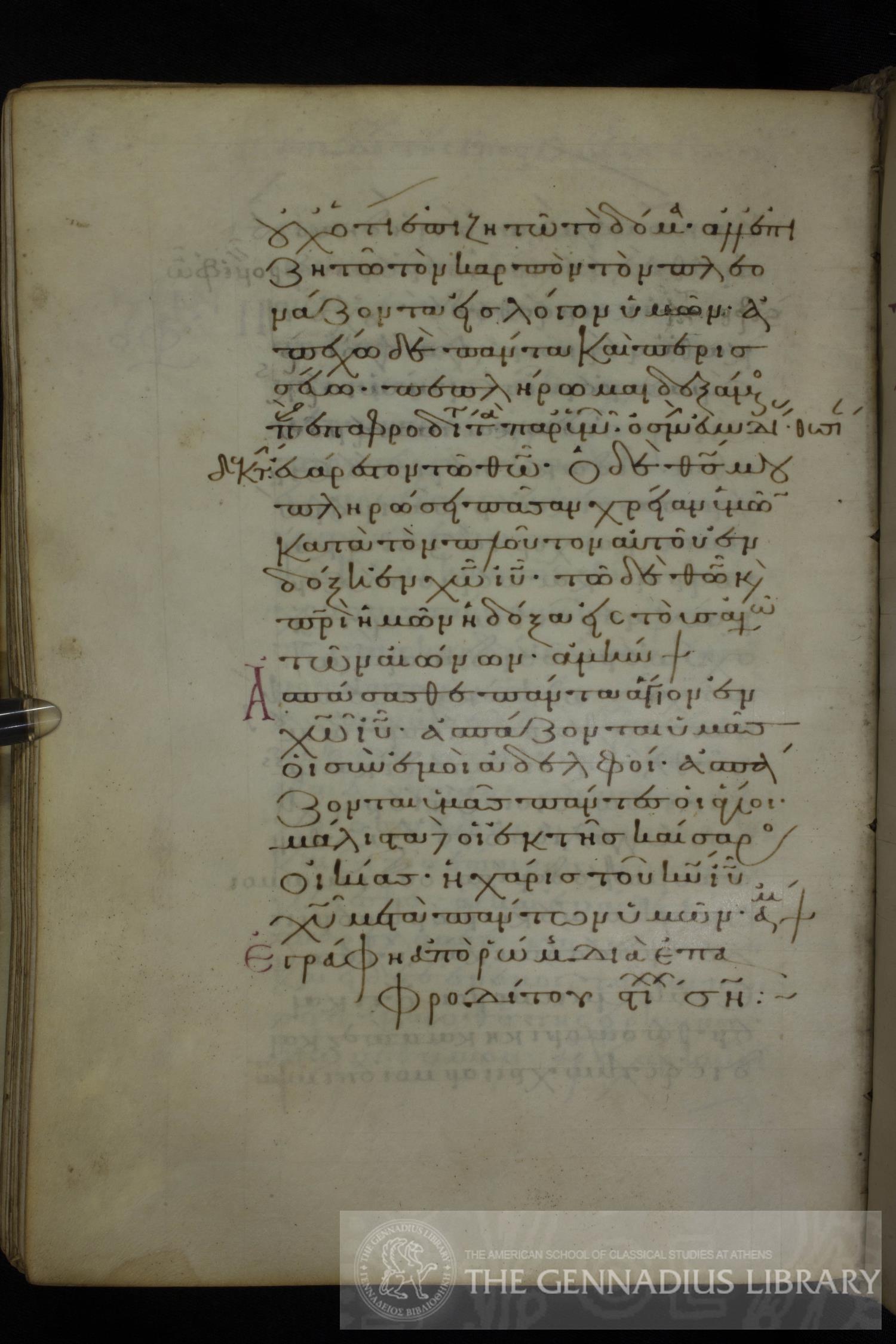 Thirteenth century manuscript of Apostolos and Pauline Epistles on parchment; 379 leaves, 1 column, 23 lines per column. For more information, please visit Gennadius Library