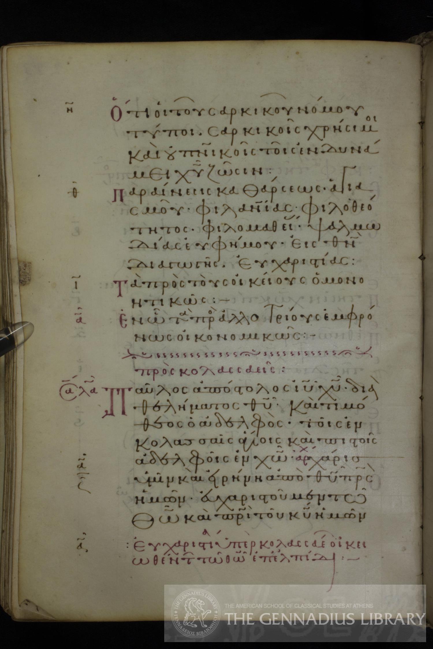 Thirteenth century manuscript of Apostolos and Pauline Epistles on parchment; 379 leaves, 1 column, 23 lines per column. For more information, please visit Gennadius Library