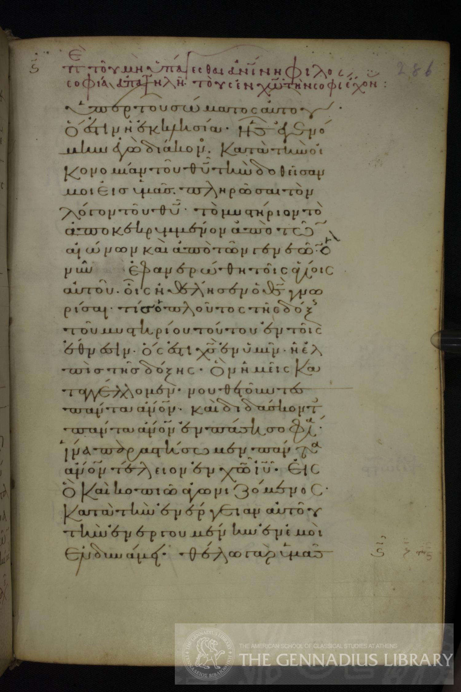 Thirteenth century manuscript of Apostolos and Pauline Epistles on parchment; 379 leaves, 1 column, 23 lines per column. For more information, please visit Gennadius Library