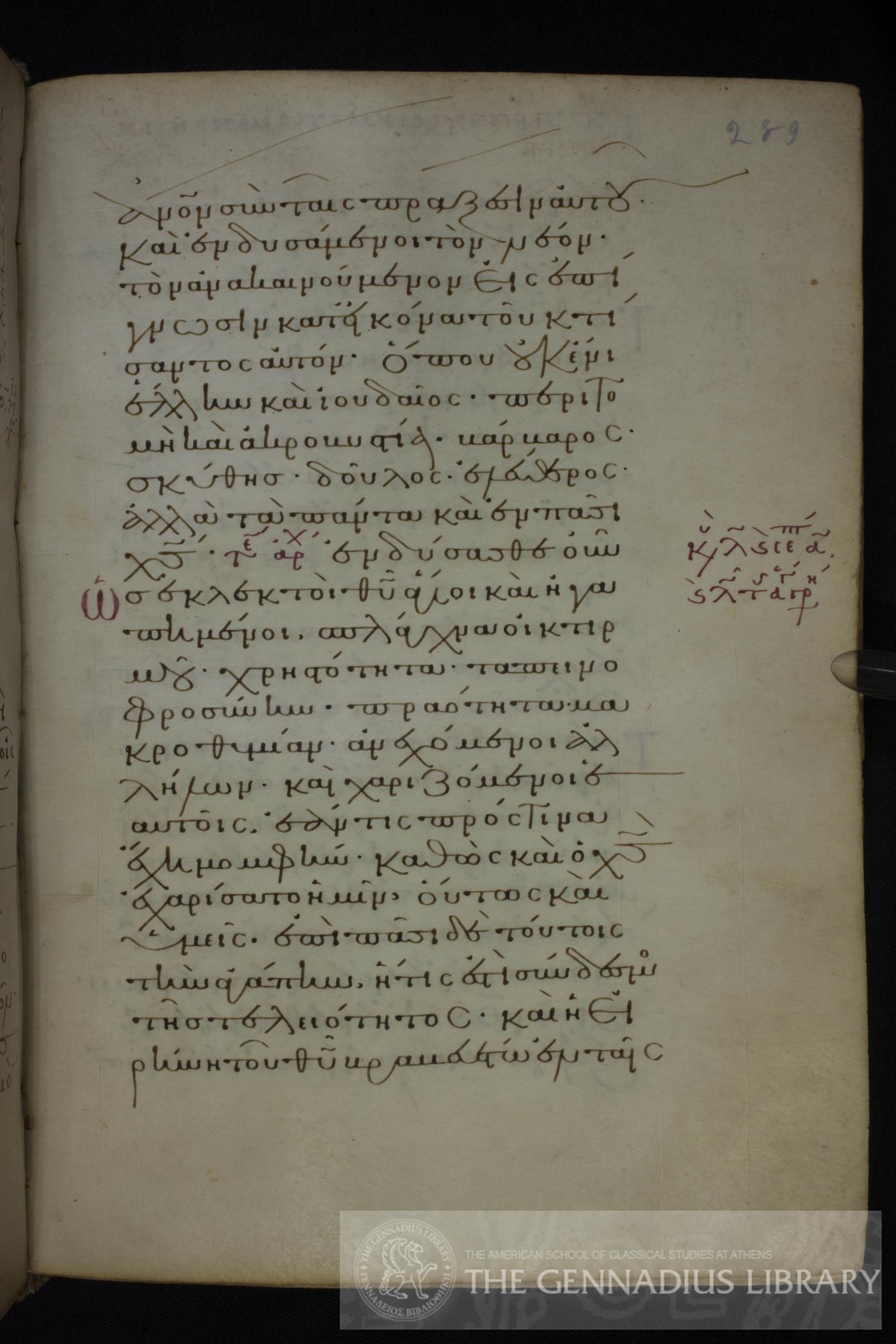 Thirteenth century manuscript of Apostolos and Pauline Epistles on parchment; 379 leaves, 1 column, 23 lines per column. For more information, please visit Gennadius Library