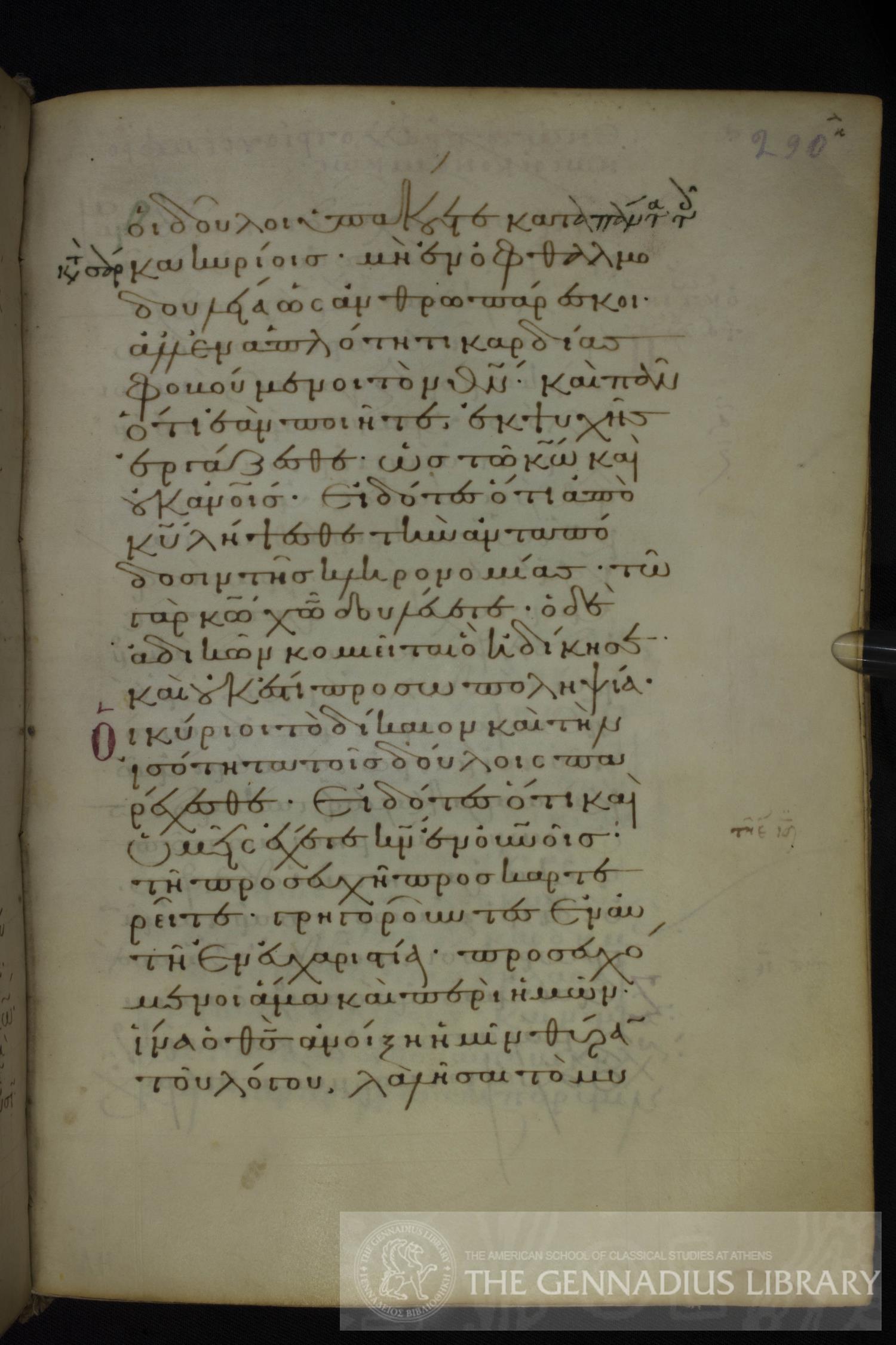 Thirteenth century manuscript of Apostolos and Pauline Epistles on parchment; 379 leaves, 1 column, 23 lines per column. For more information, please visit Gennadius Library