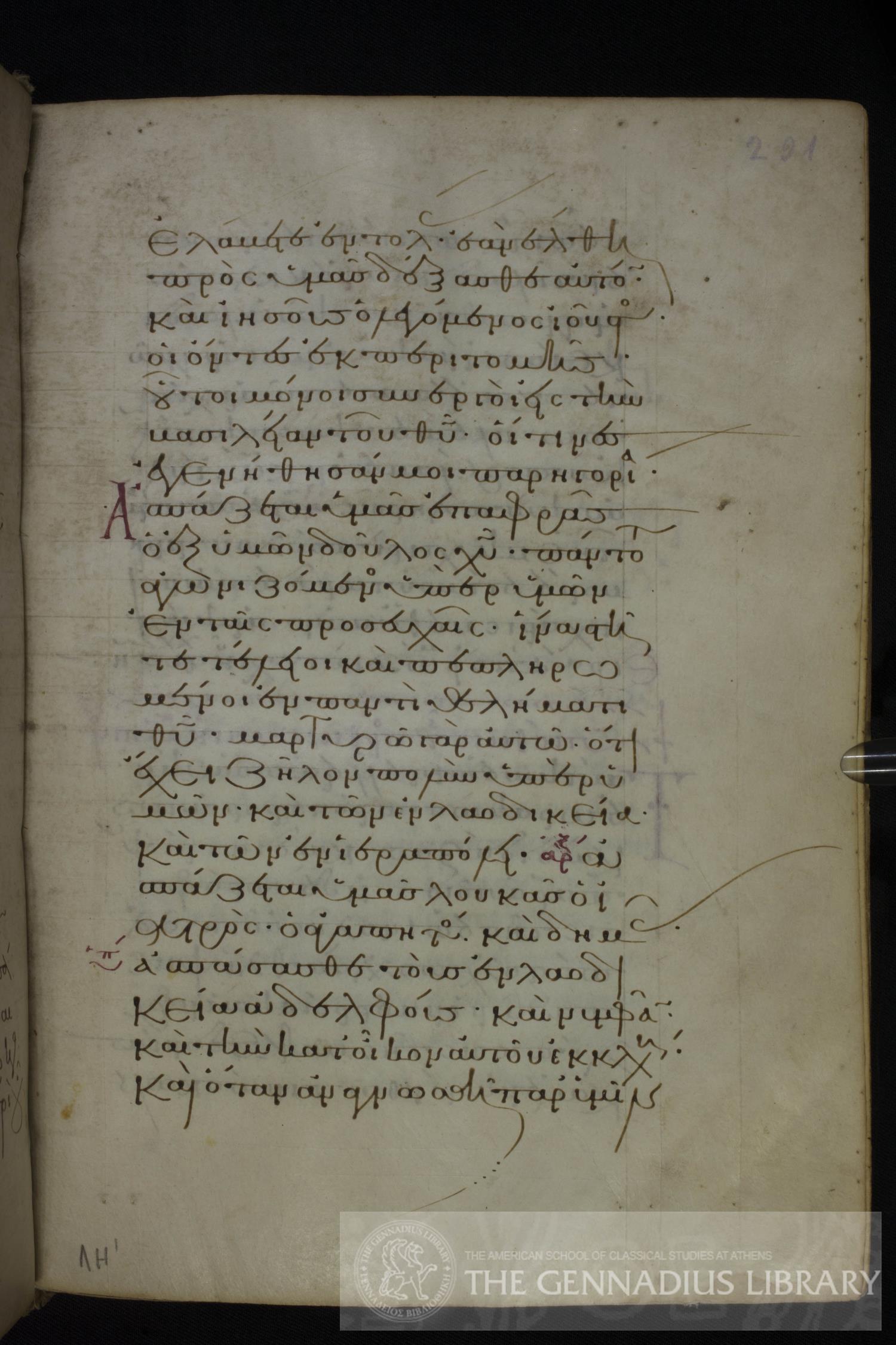 Thirteenth century manuscript of Apostolos and Pauline Epistles on parchment; 379 leaves, 1 column, 23 lines per column. For more information, please visit Gennadius Library