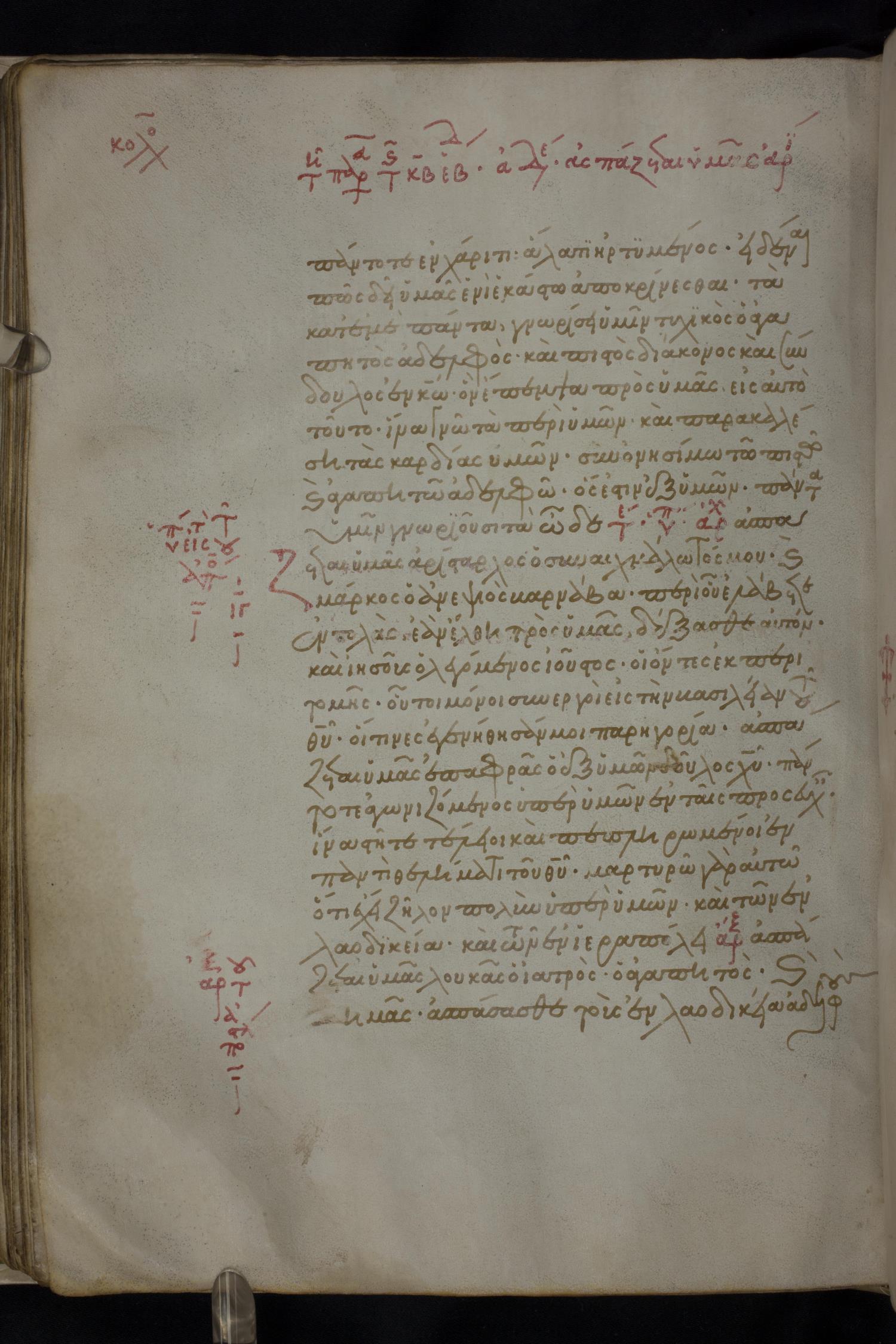 Ἀσπάζεται ὑμᾶς Ἀρίσταρχος ὁ συναιχμάλωτός μου, καὶ Μάρκος ὁ ἀνεψιὸς Βαρνάβα, περὶ οὗ ἐλάβετε ἐντολάς, ἐὰν ἔλθῃ πρὸς ὑμᾶς δέξασθε αὐτόν