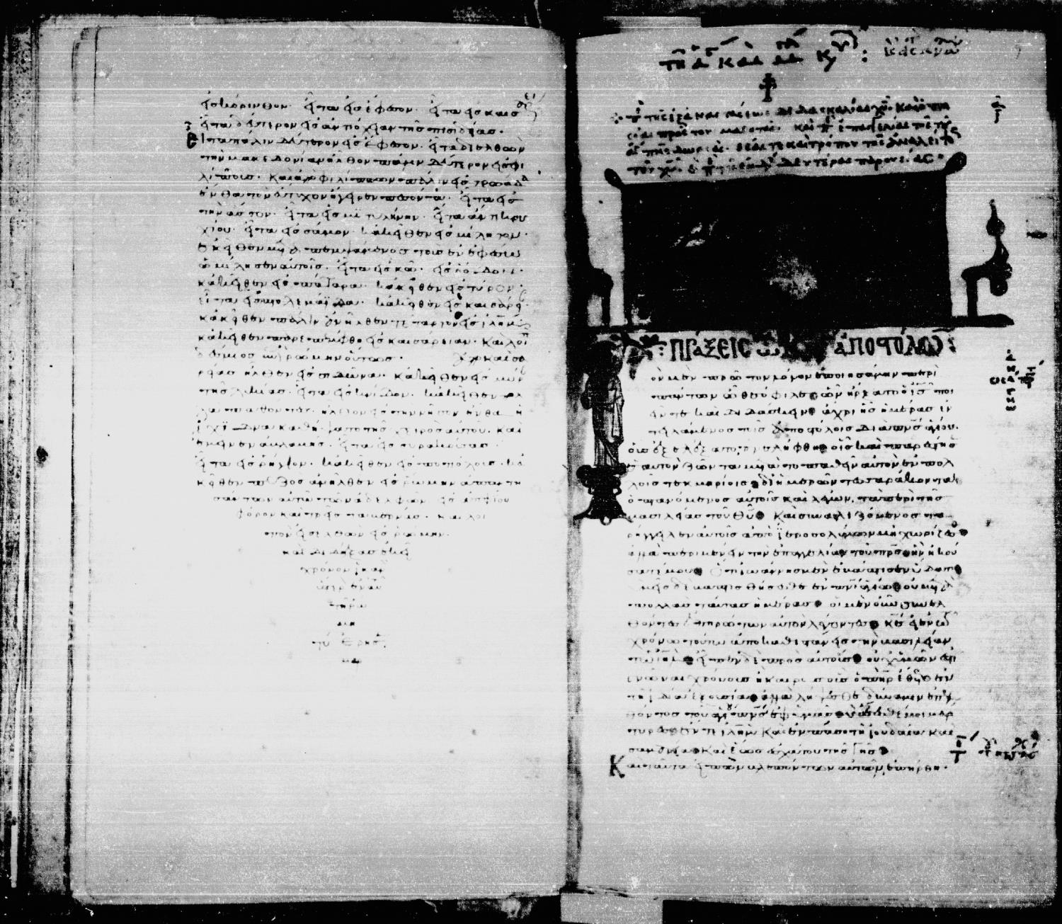Twelfth century minuscule of the Gospels, Apostolos, and Paul on parchment; 297 leaves, single column, 38 lines per column. Digital images are from microfilm.