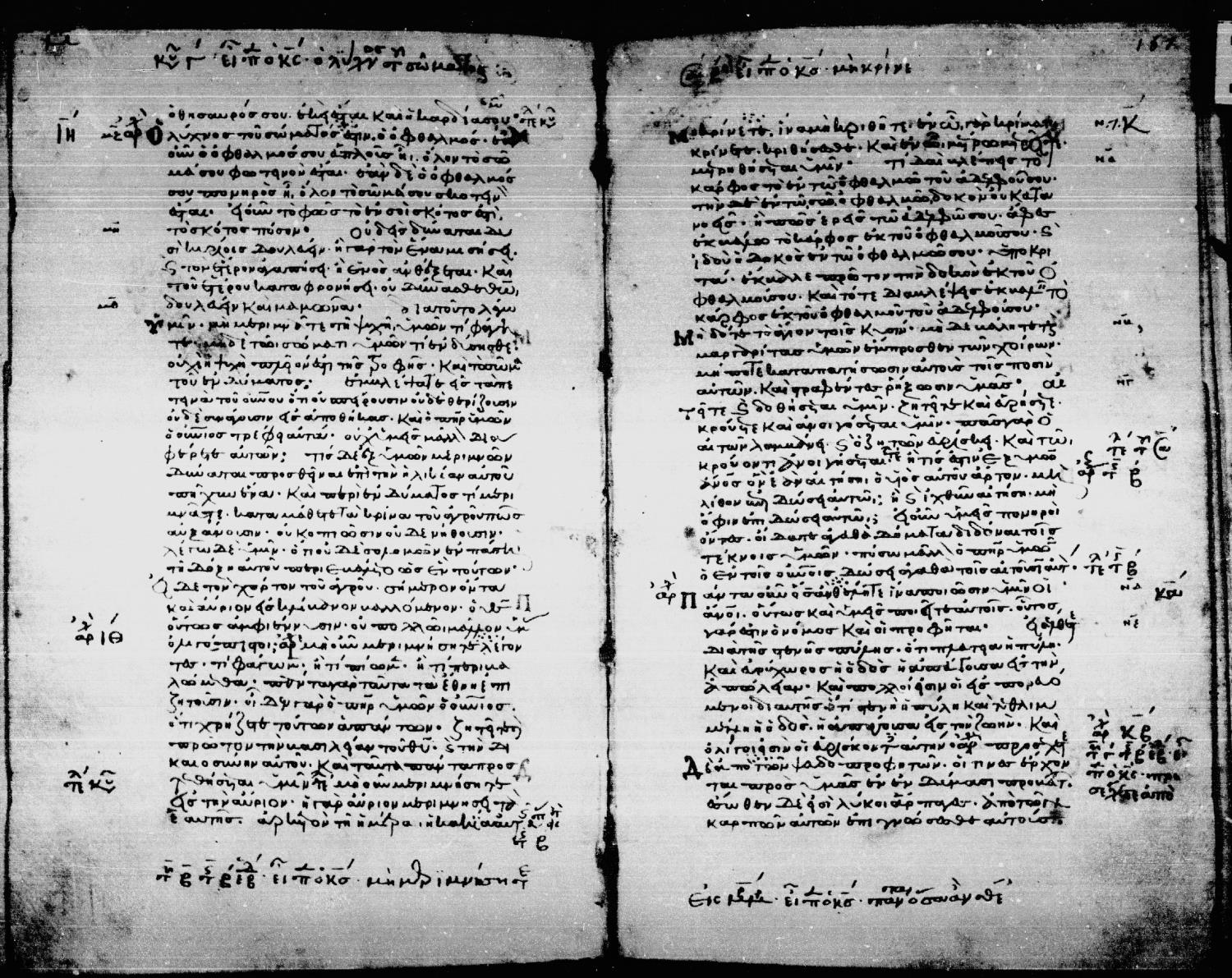 Twelfth century minuscule of the Gospels, Apostolos, and Paul on parchment; 297 leaves, single column, 38 lines per column. Digital images are from microfilm.
