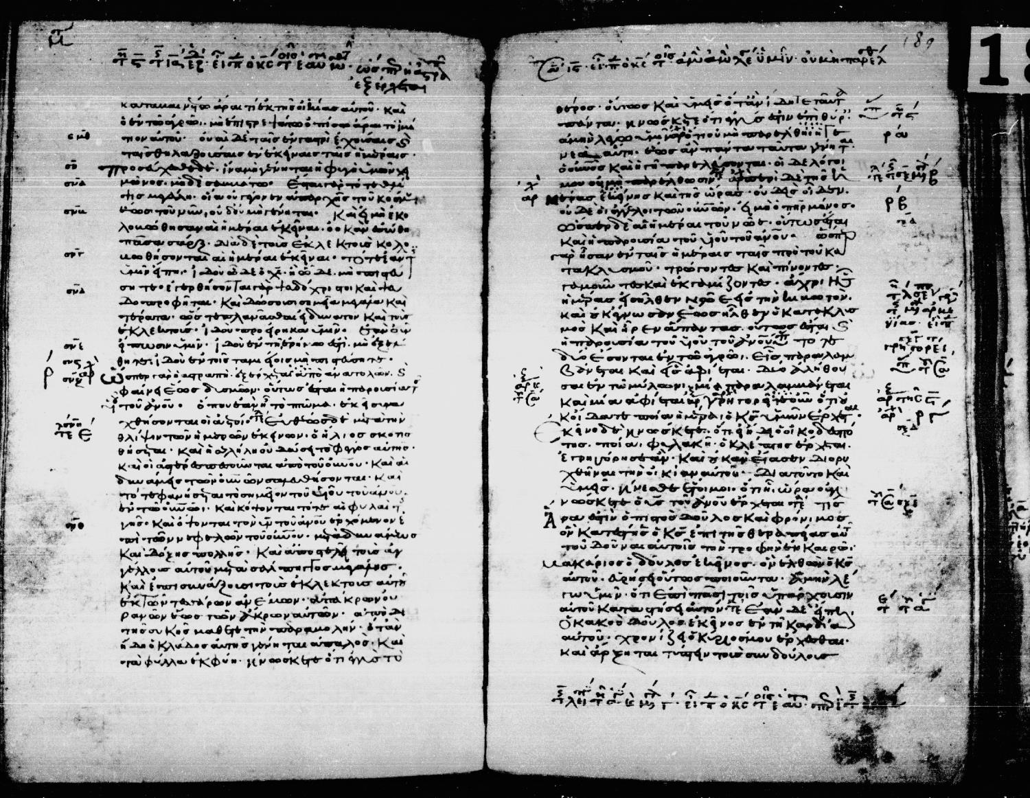 Twelfth century minuscule of the Gospels, Apostolos, and Paul on parchment; 297 leaves, single column, 38 lines per column. Digital images are from microfilm.
