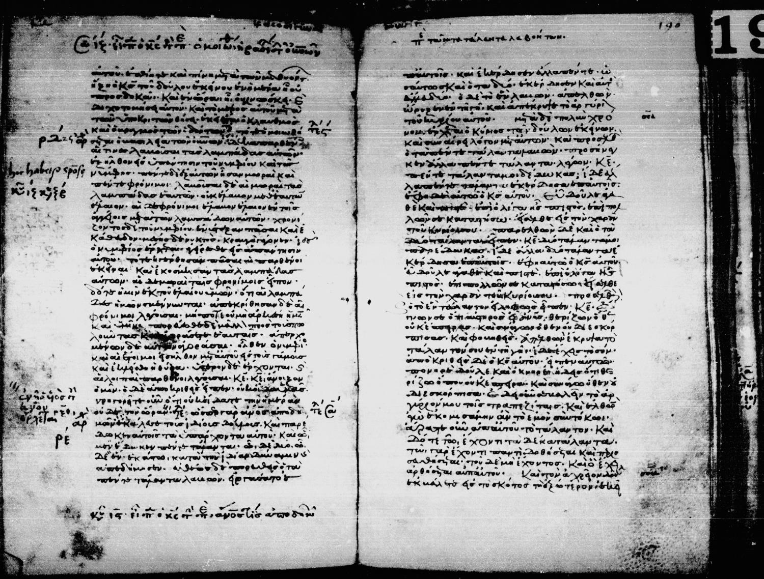 Twelfth century minuscule of the Gospels, Apostolos, and Paul on parchment; 297 leaves, single column, 38 lines per column. Digital images are from microfilm.