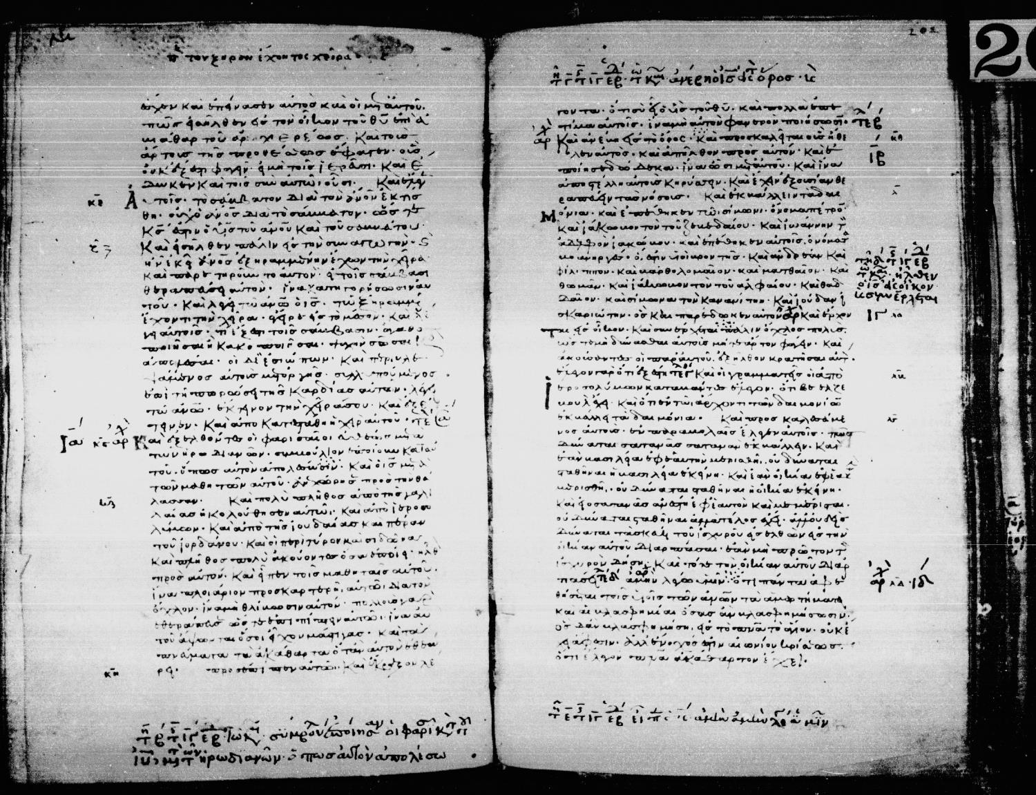 Twelfth century minuscule of the Gospels, Apostolos, and Paul on parchment; 297 leaves, single column, 38 lines per column. Digital images are from microfilm.