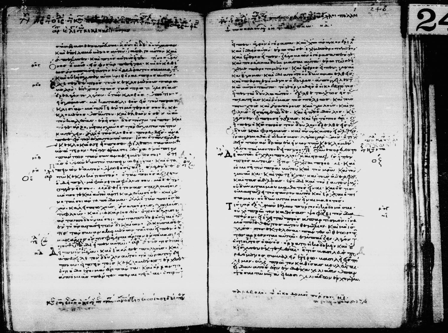Twelfth century minuscule of the Gospels, Apostolos, and Paul on parchment; 297 leaves, single column, 38 lines per column. Digital images are from microfilm.