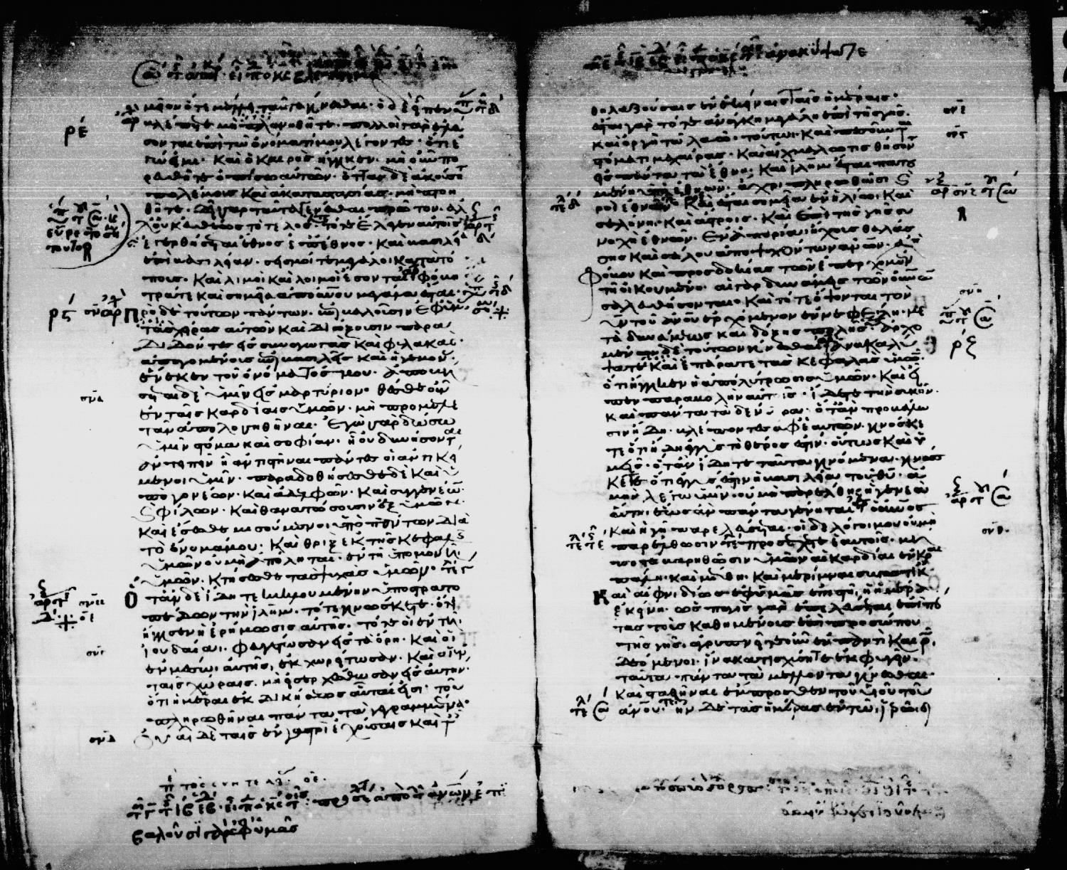Twelfth century minuscule of the Gospels, Apostolos, and Paul on parchment; 297 leaves, single column, 38 lines per column. Digital images are from microfilm.