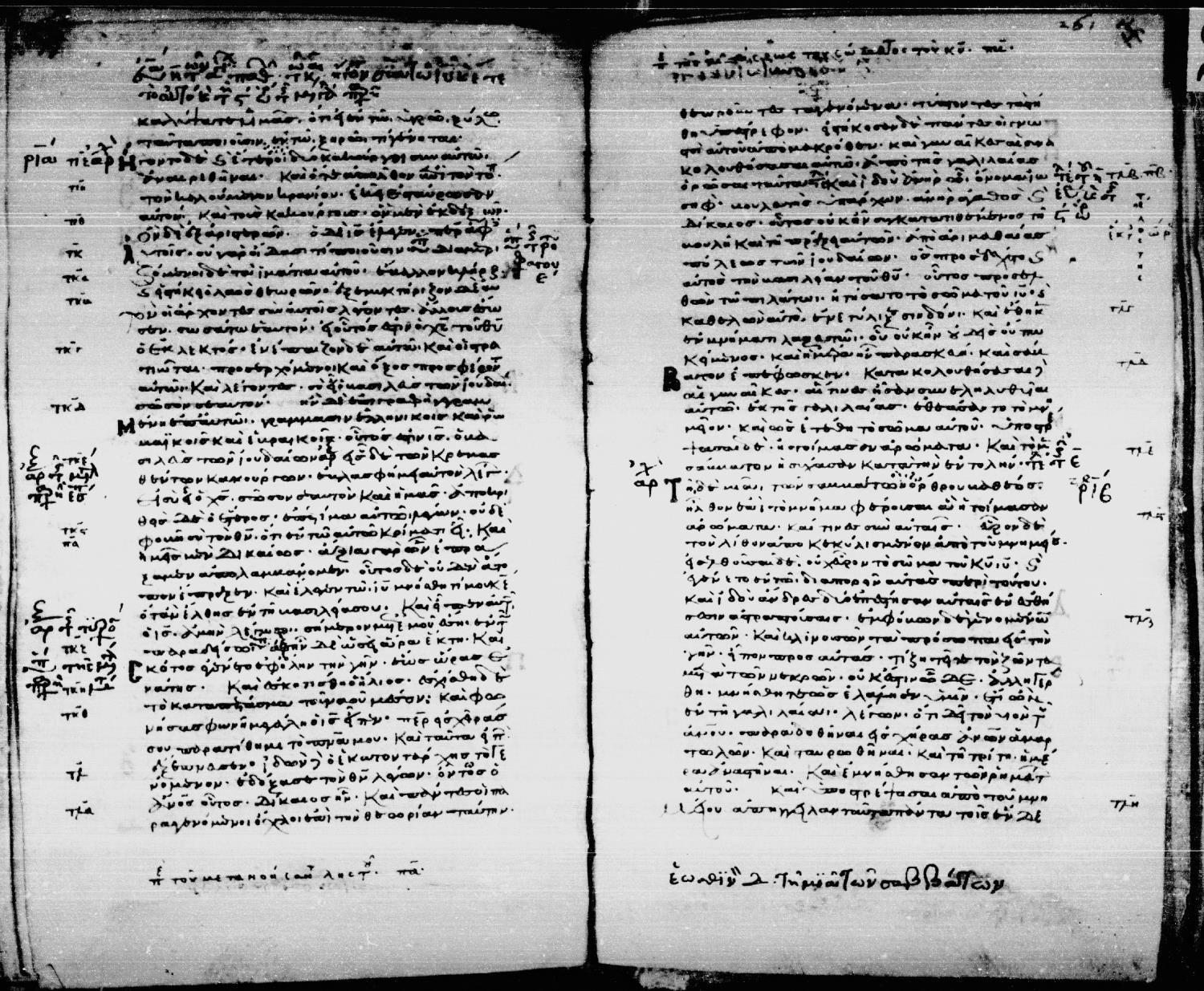 Twelfth century minuscule of the Gospels, Apostolos, and Paul on parchment; 297 leaves, single column, 38 lines per column. Digital images are from microfilm.