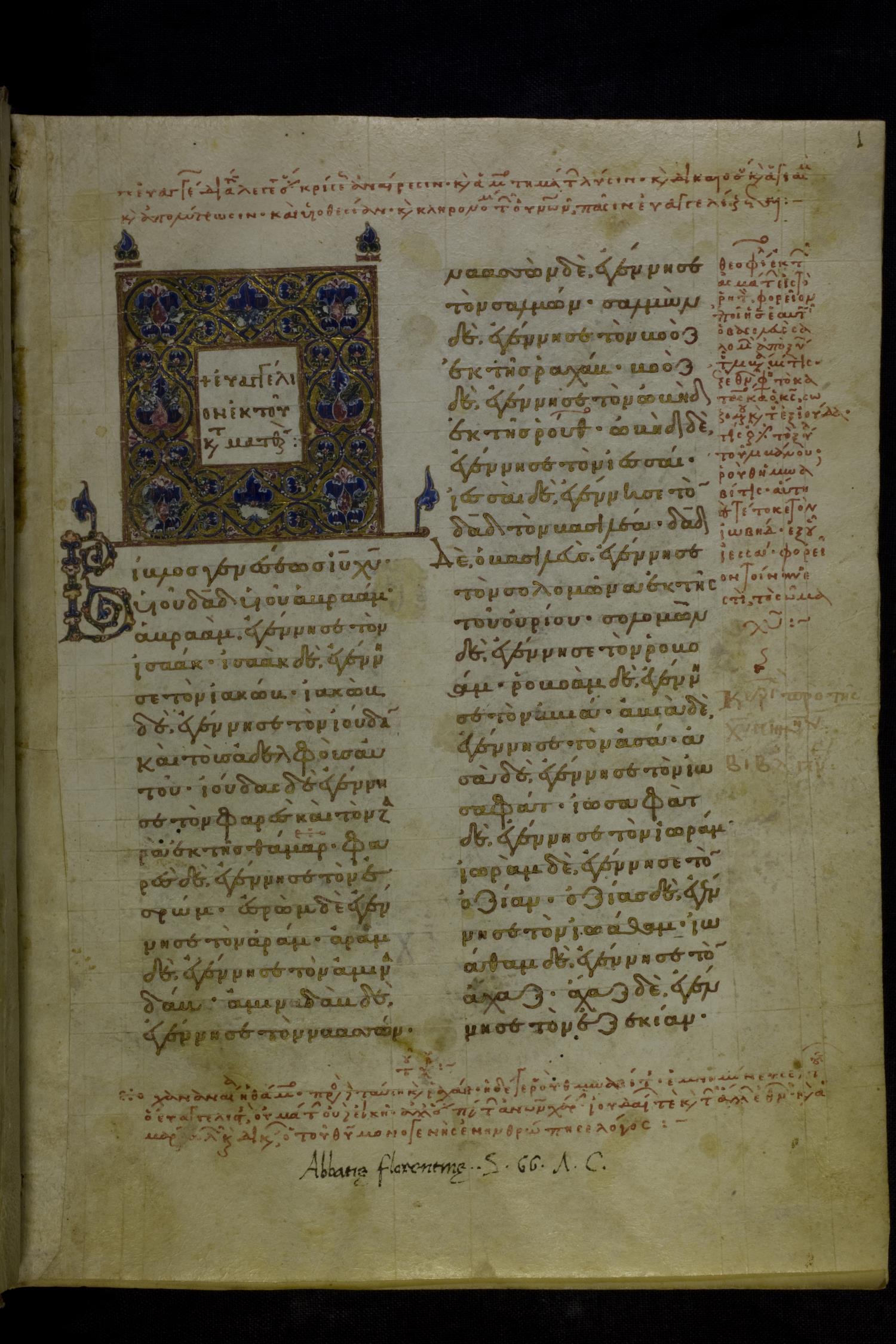 ΒΙΒΛΟΣ γενέσεως Ἰησοῦ Χριστοῦ υἱοῦ Δαυεὶδ / Δαυὶδ υἱοῦ Ἀβραάμ.