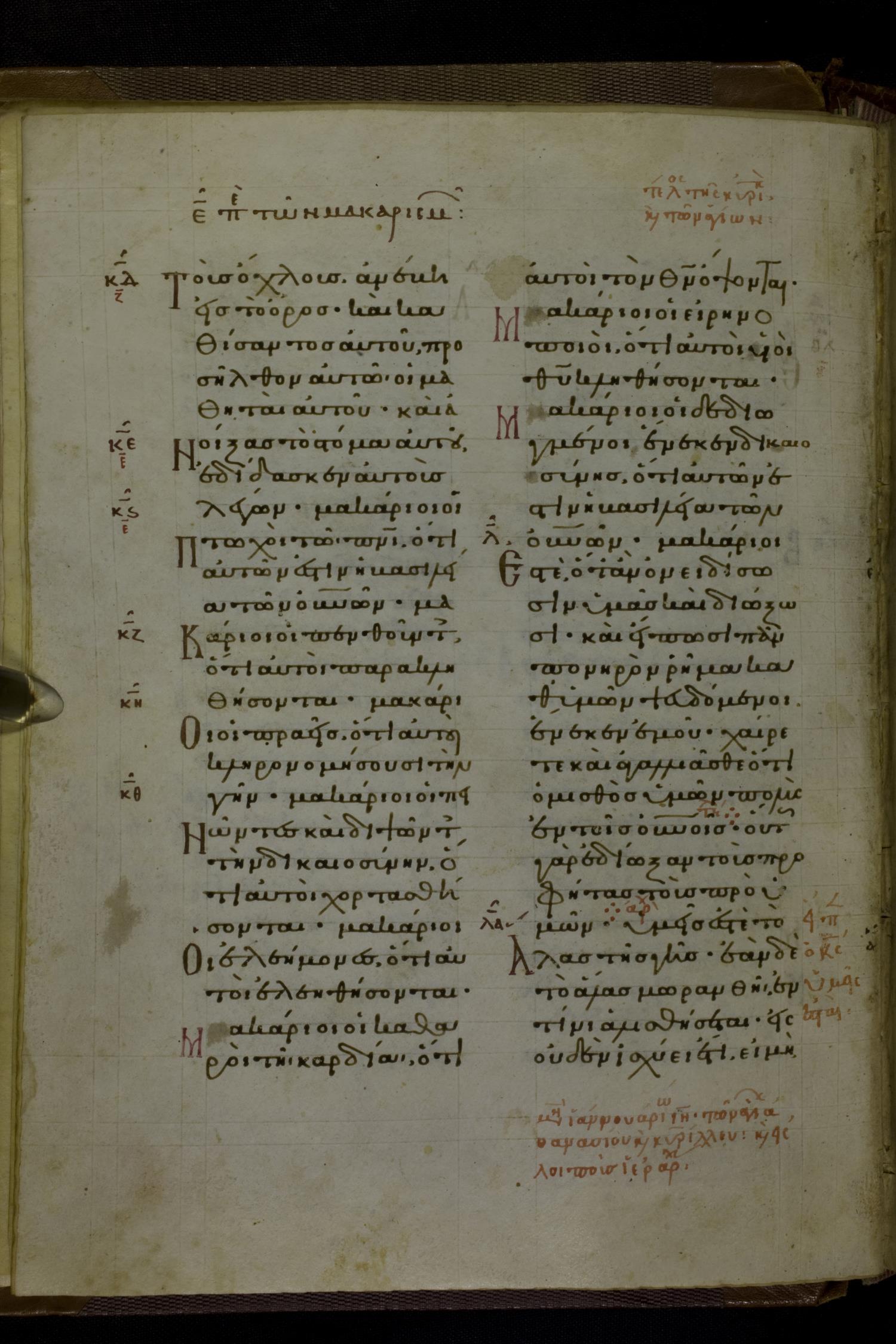 Eleventh century manuscript of the Gospels on parchment; 230 leaves, 2 columns, 25 lines per column. By agreement with the owners of the manuscript, the images posted online are 100dpi. For recent digital images, visit BML Online.