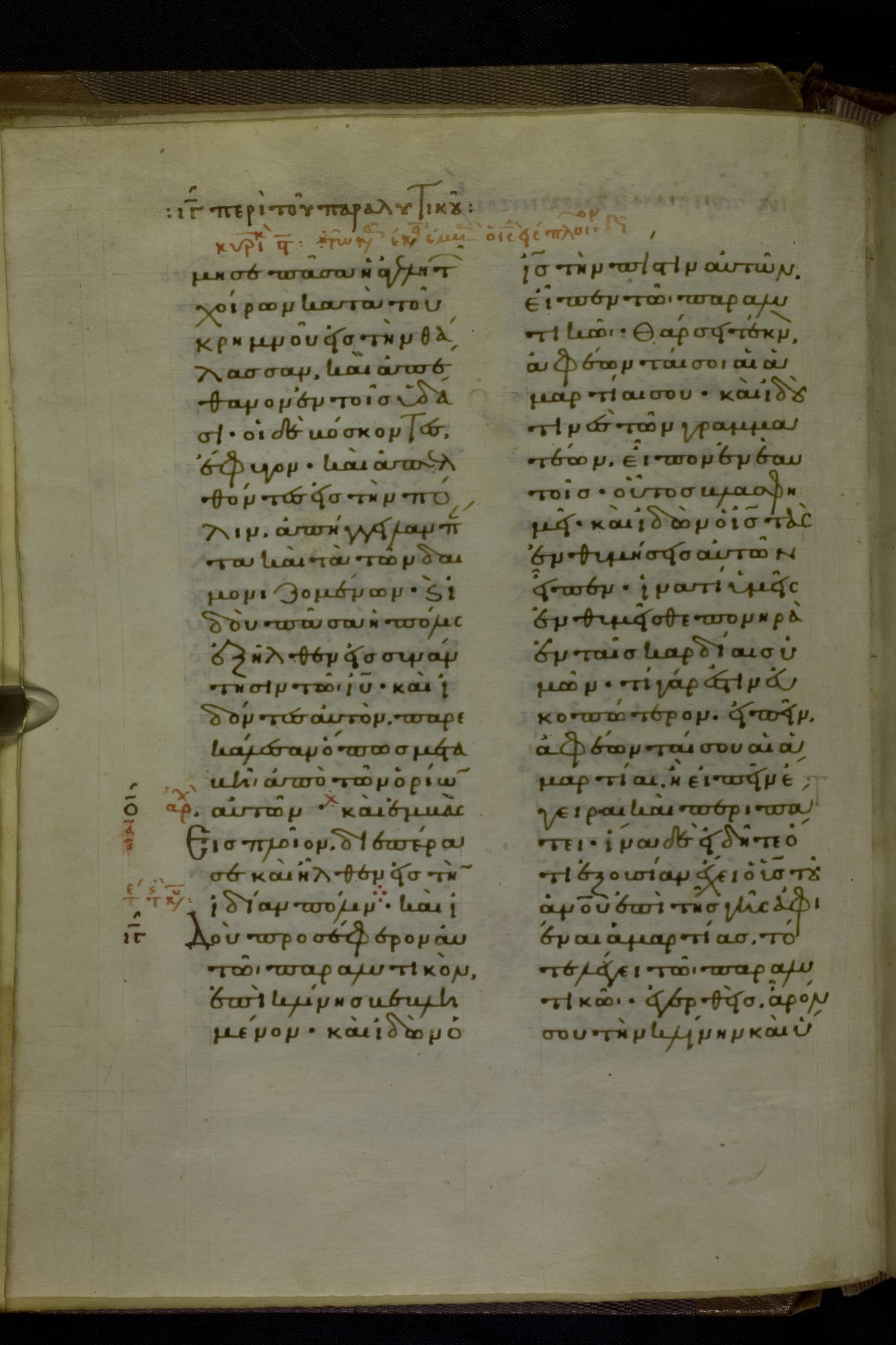 Eleventh century manuscript of the Gospels on parchment; 230 leaves, 2 columns, 25 lines per column. By agreement with the owners of the manuscript, the images posted online are 100dpi. For recent digital images, visit BML Online.