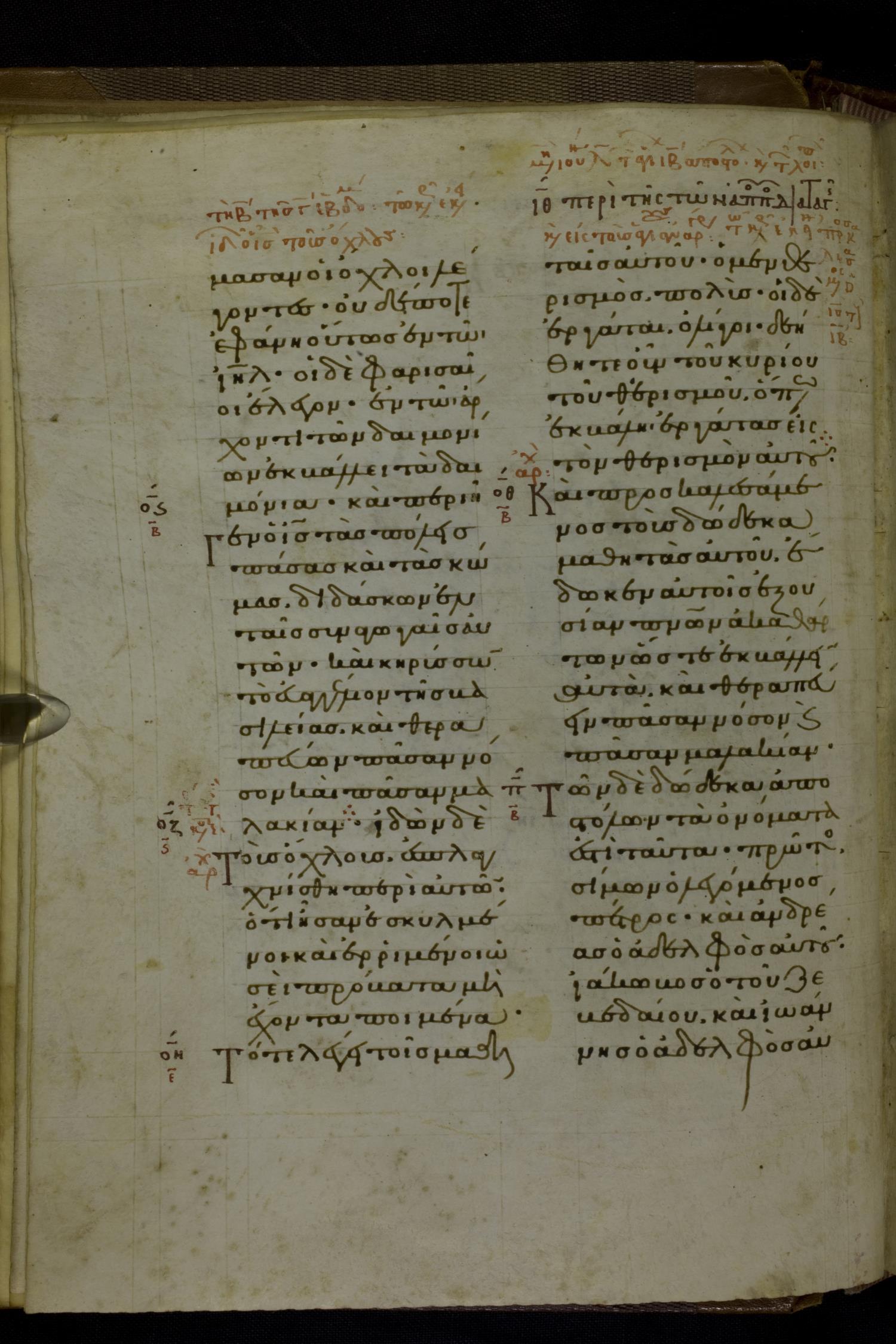 Eleventh century manuscript of the Gospels on parchment; 230 leaves, 2 columns, 25 lines per column. By agreement with the owners of the manuscript, the images posted online are 100dpi. For recent digital images, visit BML Online.