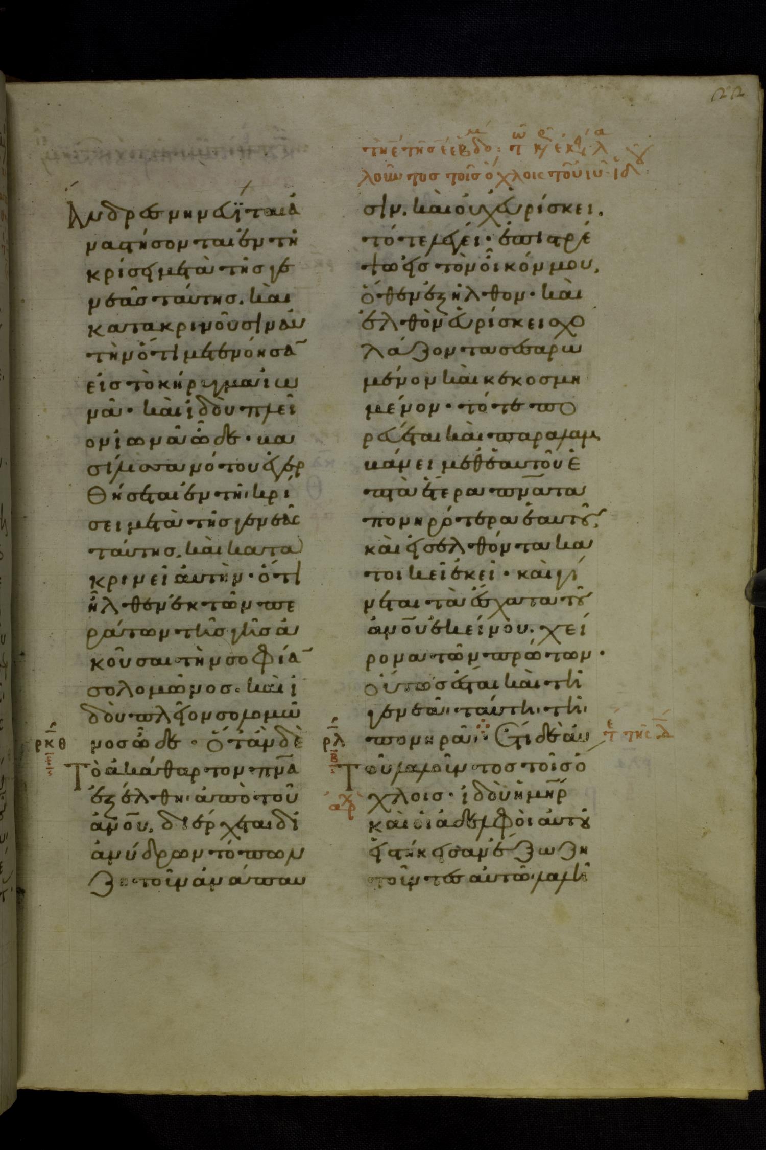 Eleventh century manuscript of the Gospels on parchment; 230 leaves, 2 columns, 25 lines per column. By agreement with the owners of the manuscript, the images posted online are 100dpi. For recent digital images, visit BML Online.