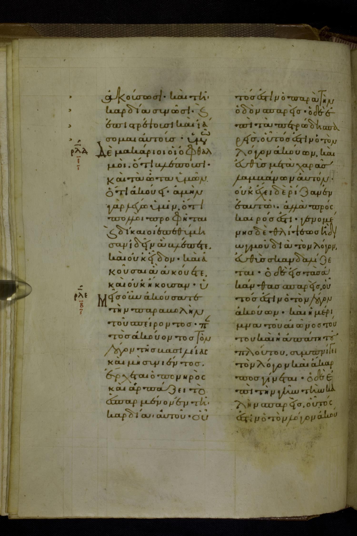 Eleventh century manuscript of the Gospels on parchment; 230 leaves, 2 columns, 25 lines per column. By agreement with the owners of the manuscript, the images posted online are 100dpi. For recent digital images, visit BML Online.