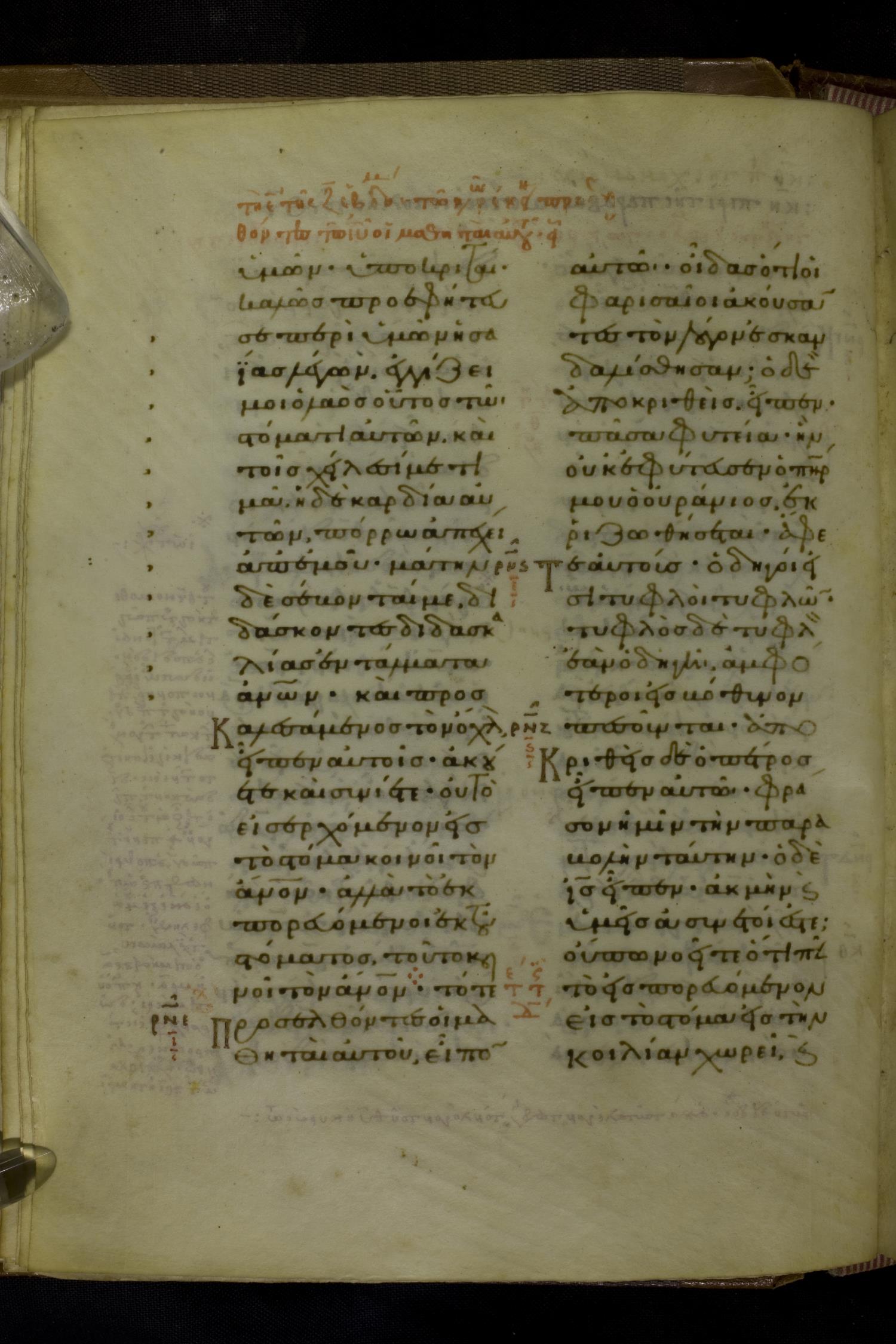 Eleventh century manuscript of the Gospels on parchment; 230 leaves, 2 columns, 25 lines per column. By agreement with the owners of the manuscript, the images posted online are 100dpi. For recent digital images, visit BML Online.