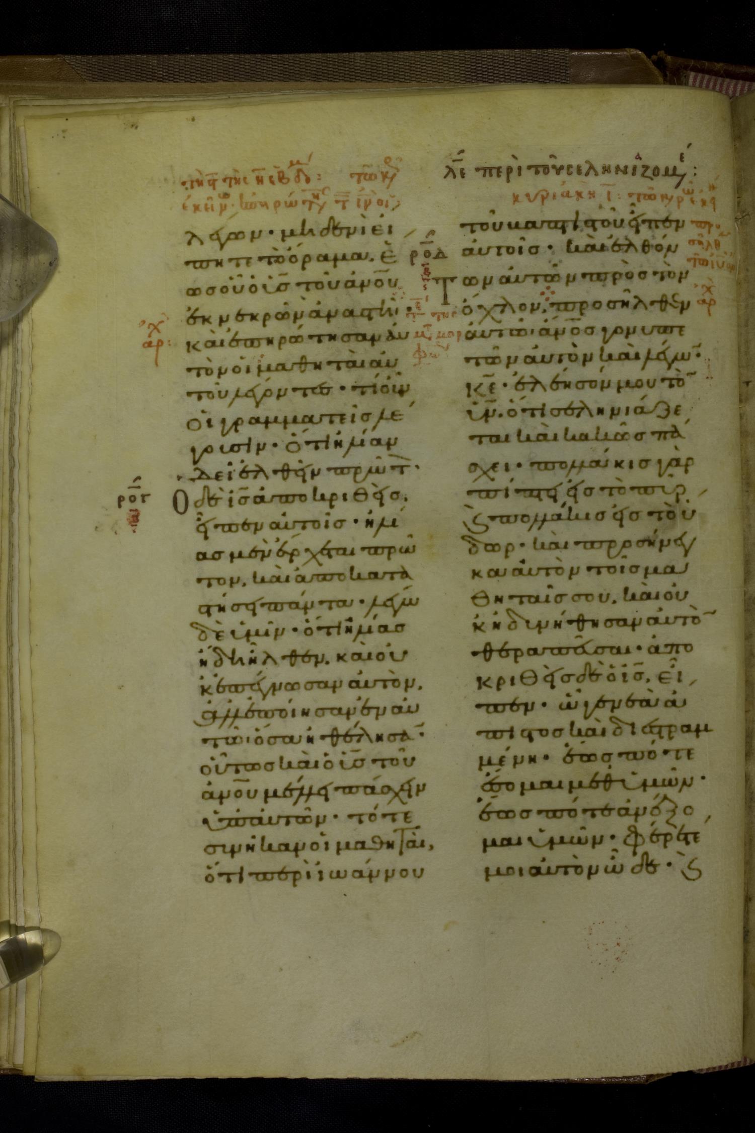 Eleventh century manuscript of the Gospels on parchment; 230 leaves, 2 columns, 25 lines per column. By agreement with the owners of the manuscript, the images posted online are 100dpi. For recent digital images, visit BML Online.
