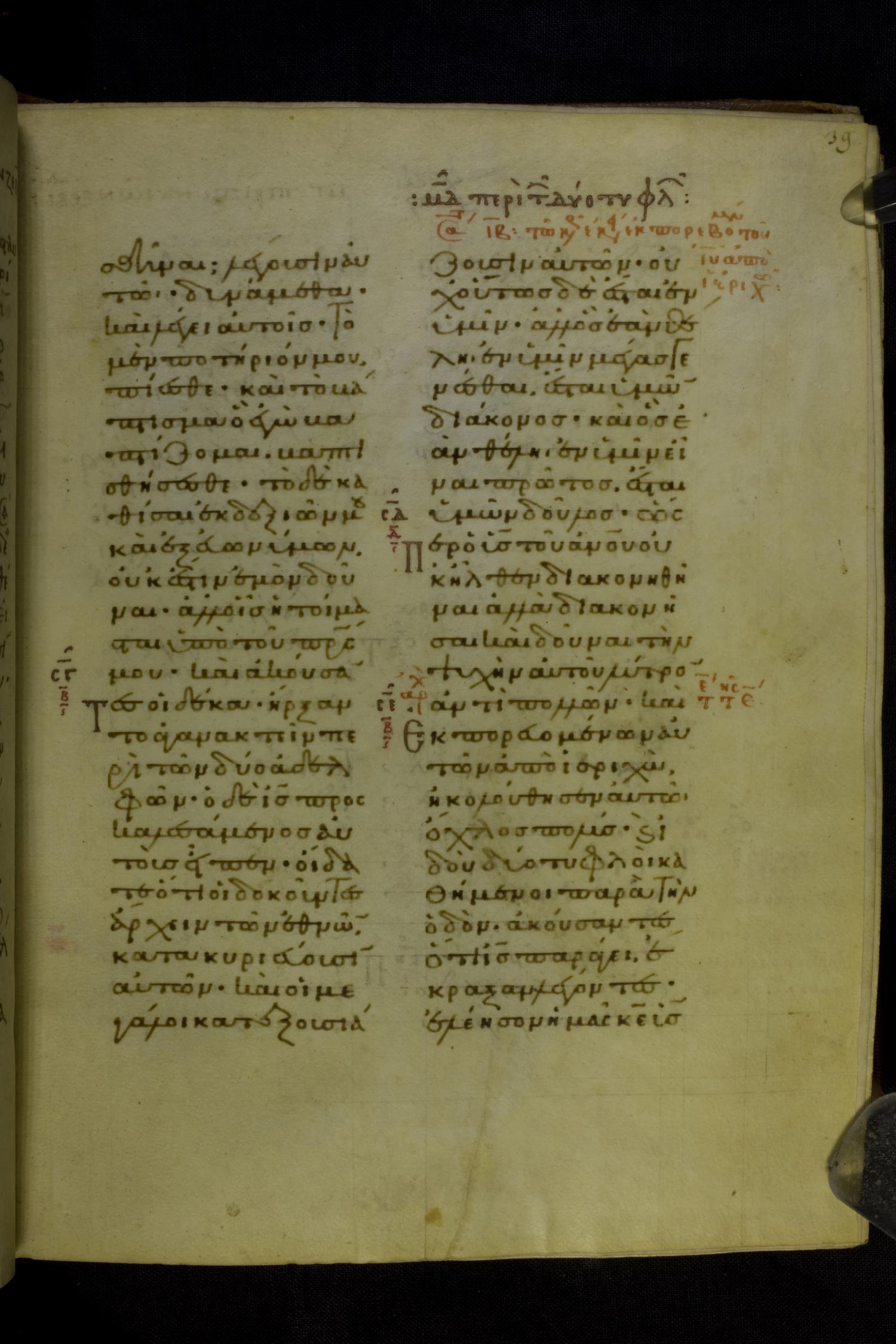 Eleventh century manuscript of the Gospels on parchment; 230 leaves, 2 columns, 25 lines per column. By agreement with the owners of the manuscript, the images posted online are 100dpi. For recent digital images, visit BML Online.