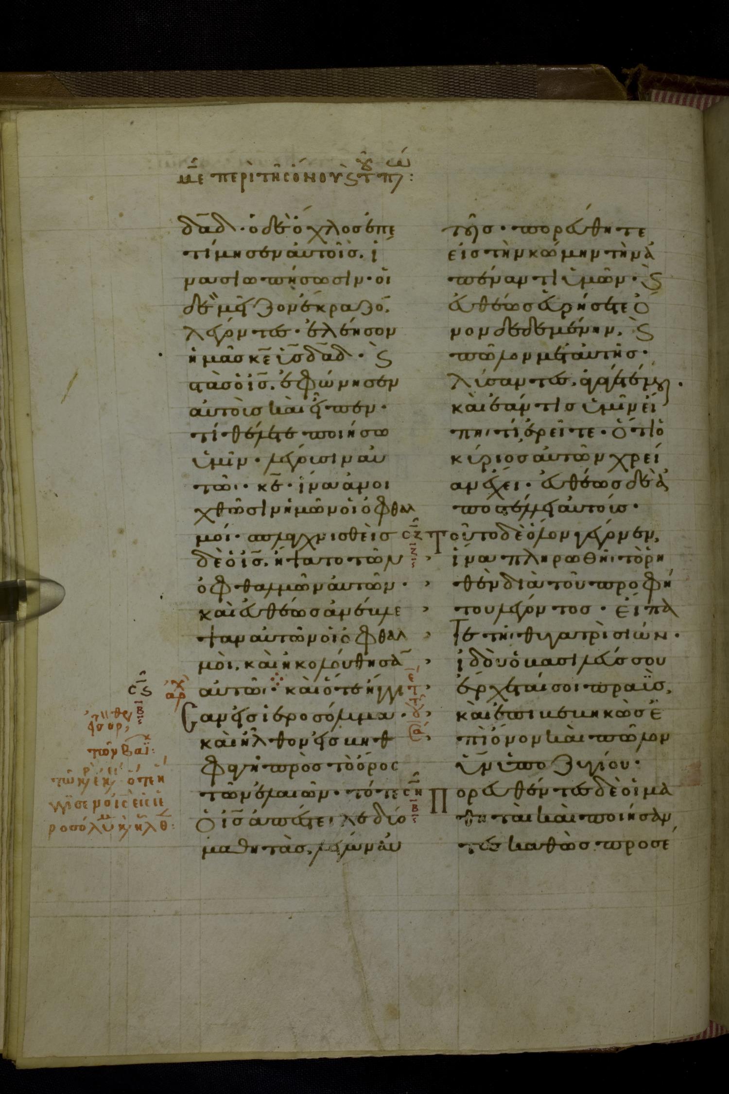 Eleventh century manuscript of the Gospels on parchment; 230 leaves, 2 columns, 25 lines per column. By agreement with the owners of the manuscript, the images posted online are 100dpi. For recent digital images, visit BML Online.