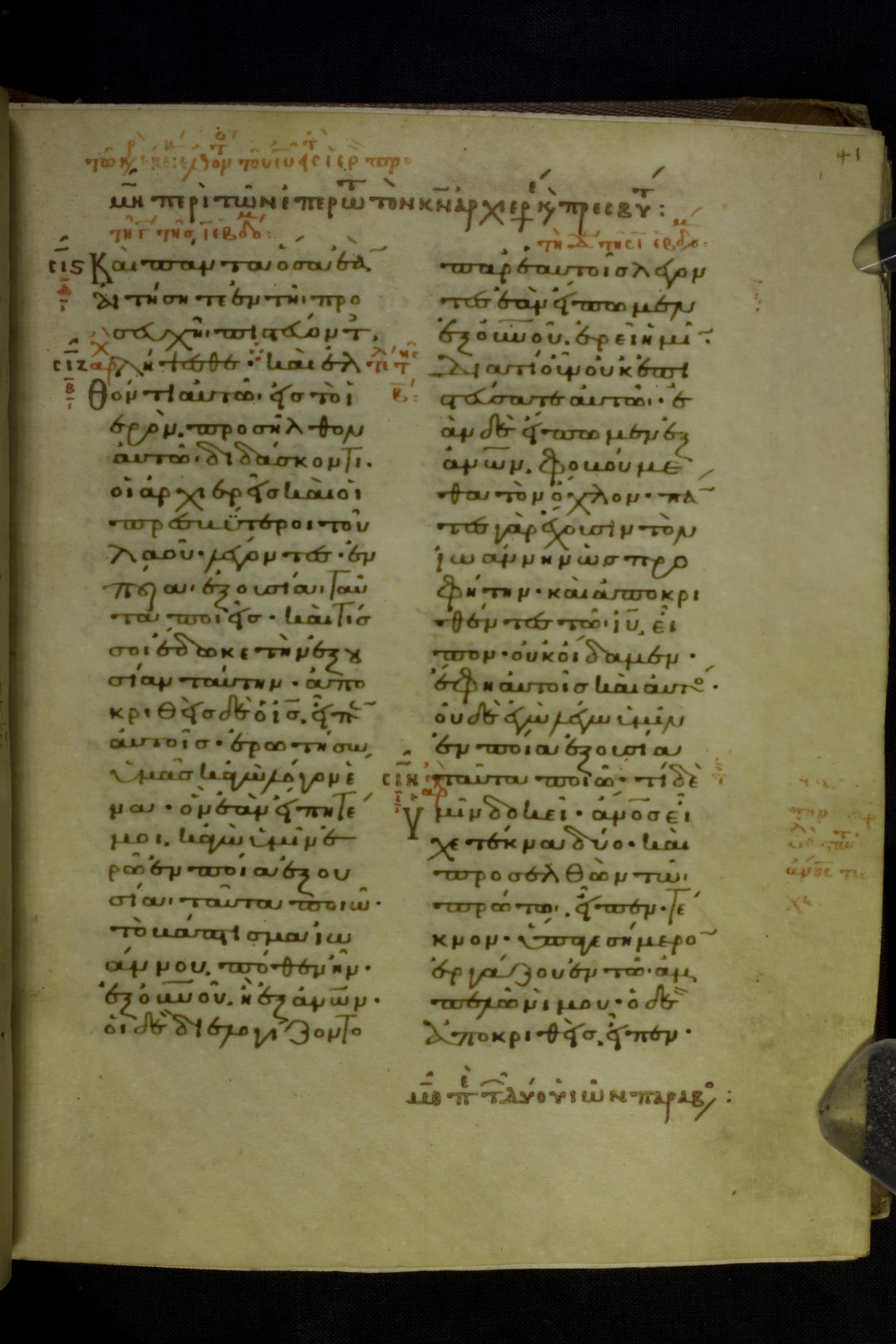 Eleventh century manuscript of the Gospels on parchment; 230 leaves, 2 columns, 25 lines per column. By agreement with the owners of the manuscript, the images posted online are 100dpi. For recent digital images, visit BML Online.