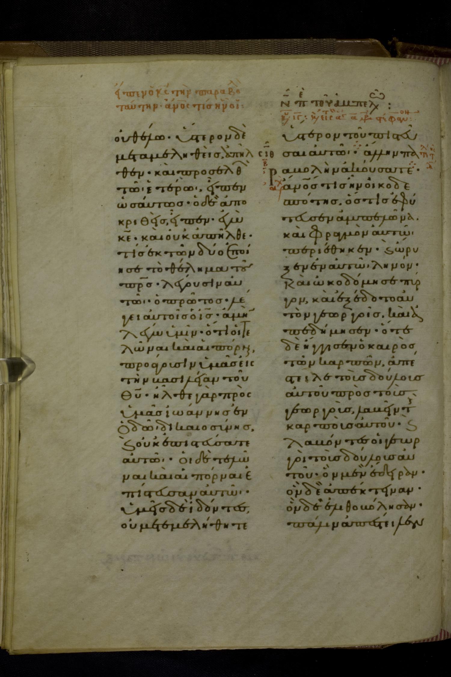 Eleventh century manuscript of the Gospels on parchment; 230 leaves, 2 columns, 25 lines per column. By agreement with the owners of the manuscript, the images posted online are 100dpi. For recent digital images, visit BML Online.