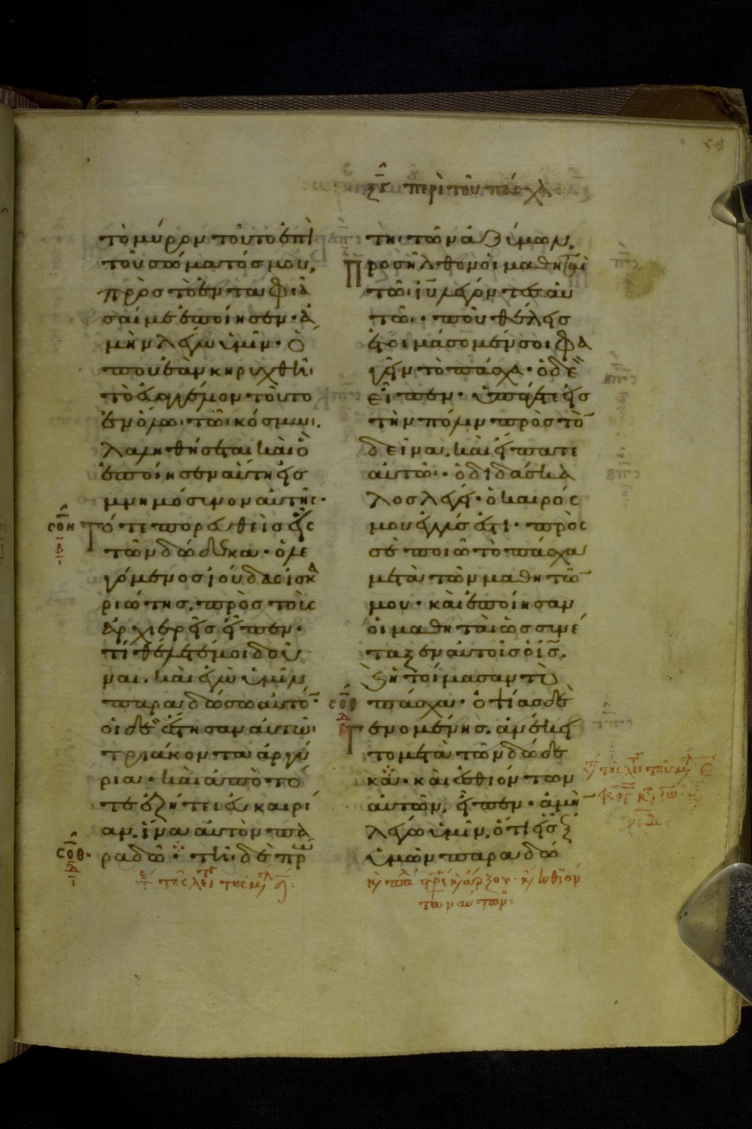 Eleventh century manuscript of the Gospels on parchment; 230 leaves, 2 columns, 25 lines per column. By agreement with the owners of the manuscript, the images posted online are 100dpi. For recent digital images, visit BML Online.