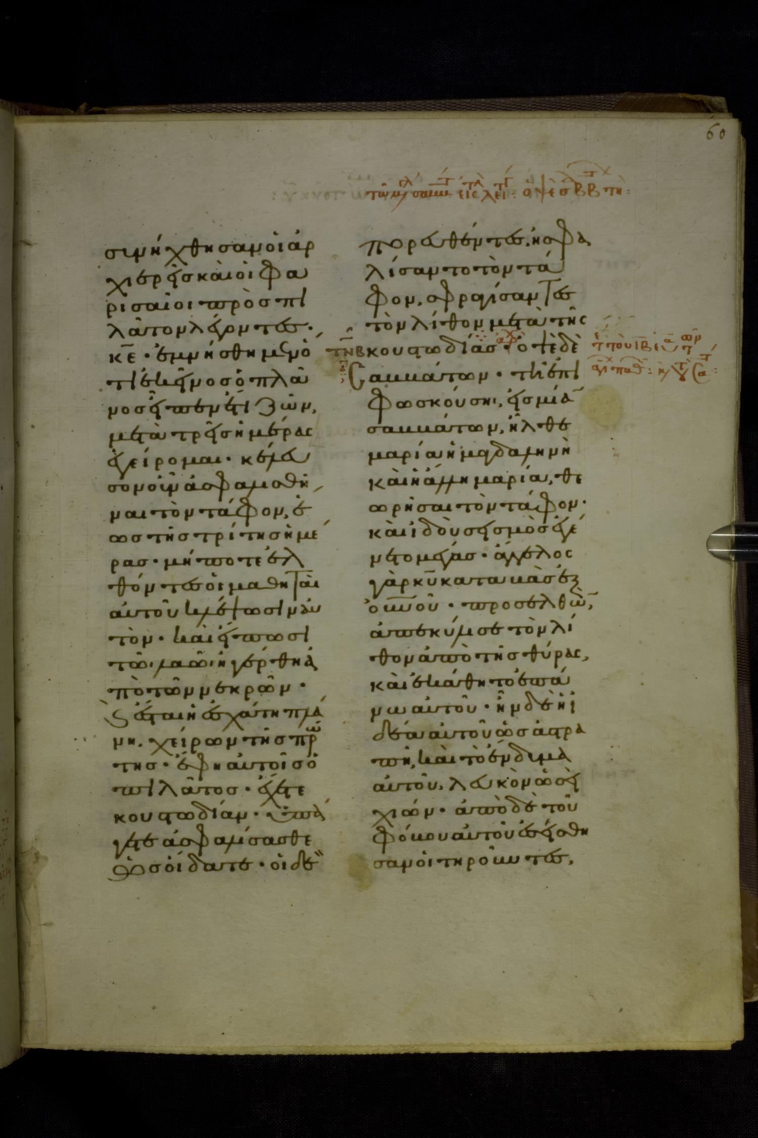 Eleventh century manuscript of the Gospels on parchment; 230 leaves, 2 columns, 25 lines per column. By agreement with the owners of the manuscript, the images posted online are 100dpi. For recent digital images, visit BML Online.