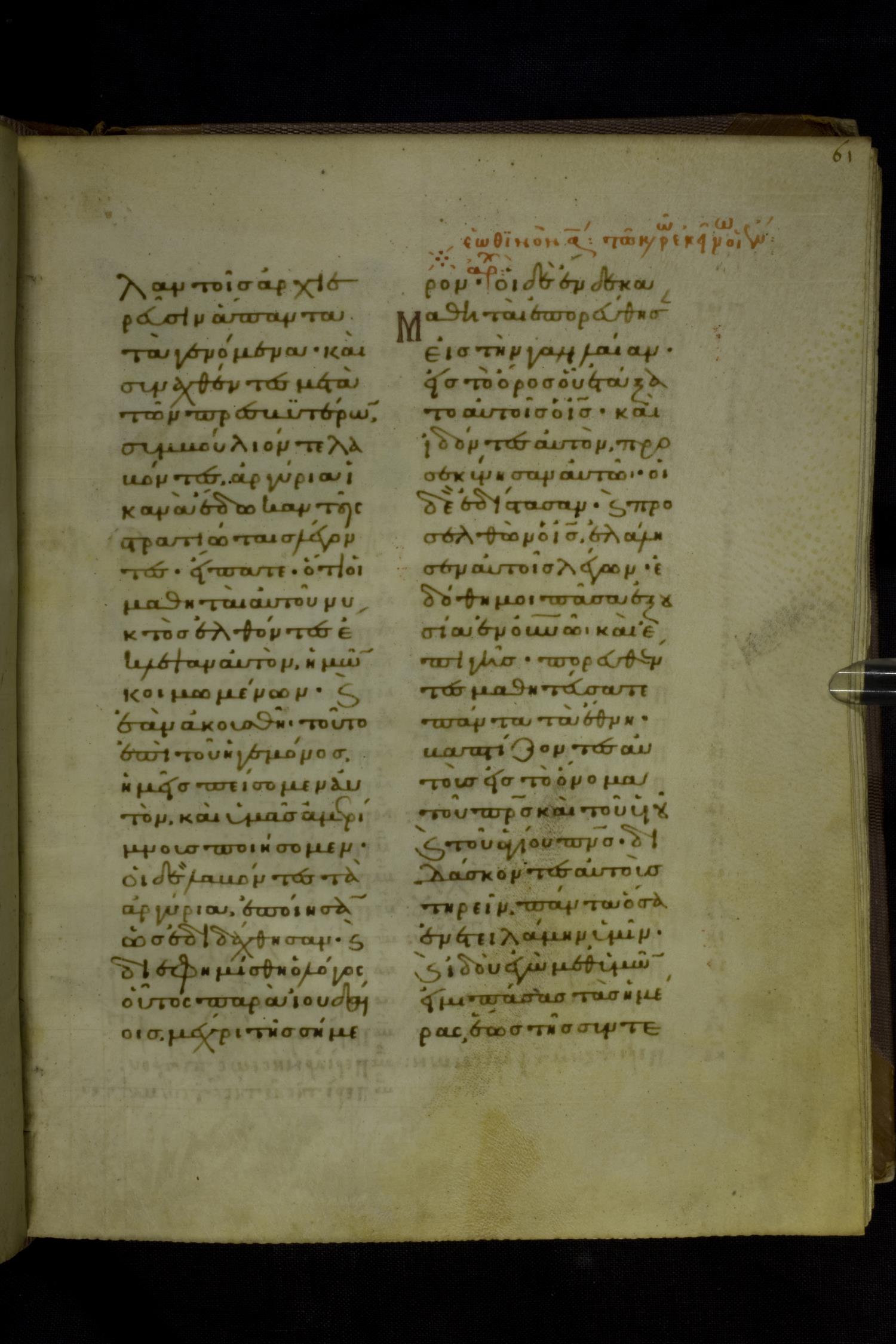 Eleventh century manuscript of the Gospels on parchment; 230 leaves, 2 columns, 25 lines per column. By agreement with the owners of the manuscript, the images posted online are 100dpi. For recent digital images, visit BML Online.