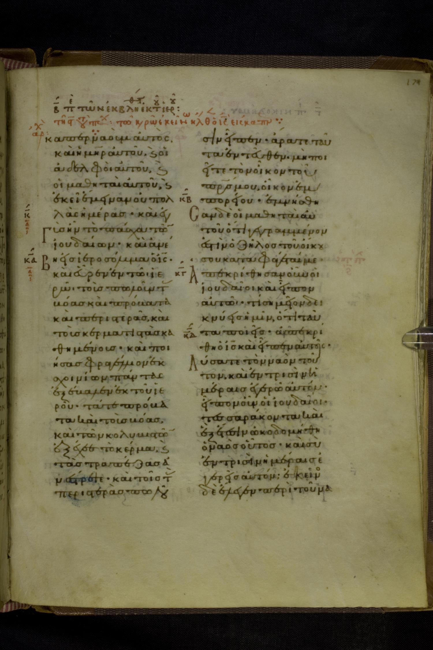 Eleventh century manuscript of the Gospels on parchment; 230 leaves, 2 columns, 25 lines per column. By agreement with the owners of the manuscript, the images posted online are 100dpi. For recent digital images, visit BML Online.
