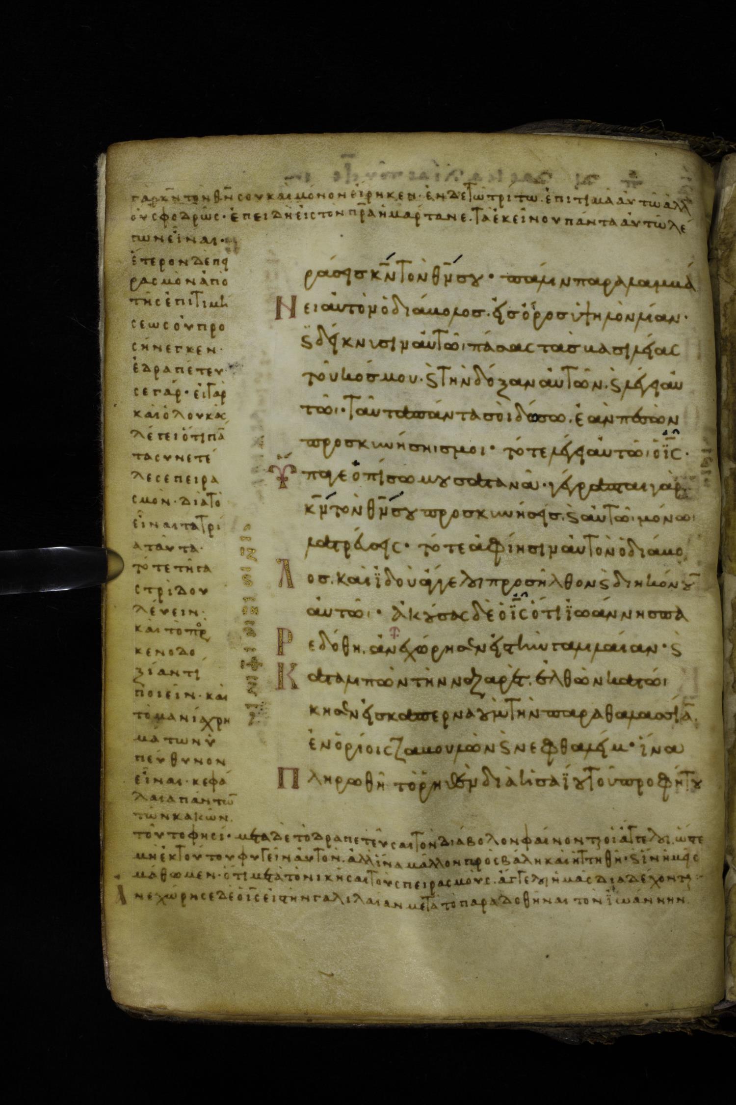 Eleventh century minuscule of the Gospels with commentary on parchment; 289 leaves, single column, 15-17 lines per column. Images were taken at the Hellenic Parliament Library in Athens.