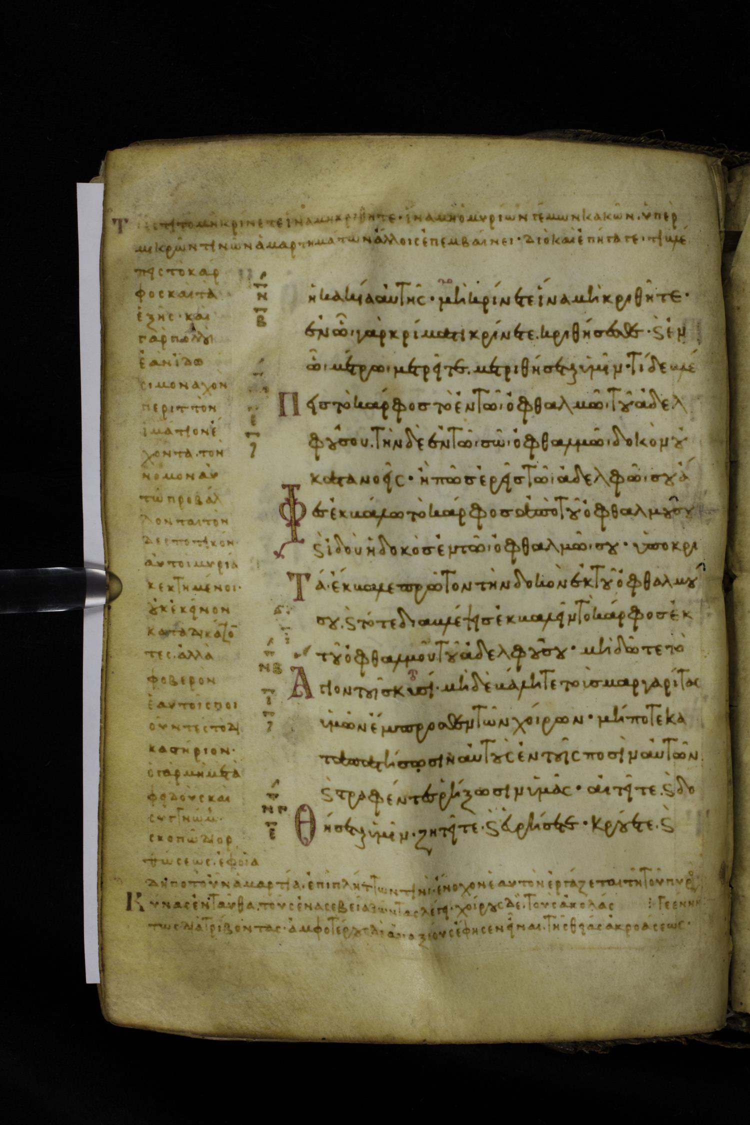 Eleventh century minuscule of the Gospels with commentary on parchment; 289 leaves, single column, 15-17 lines per column. Images were taken at the Hellenic Parliament Library in Athens.