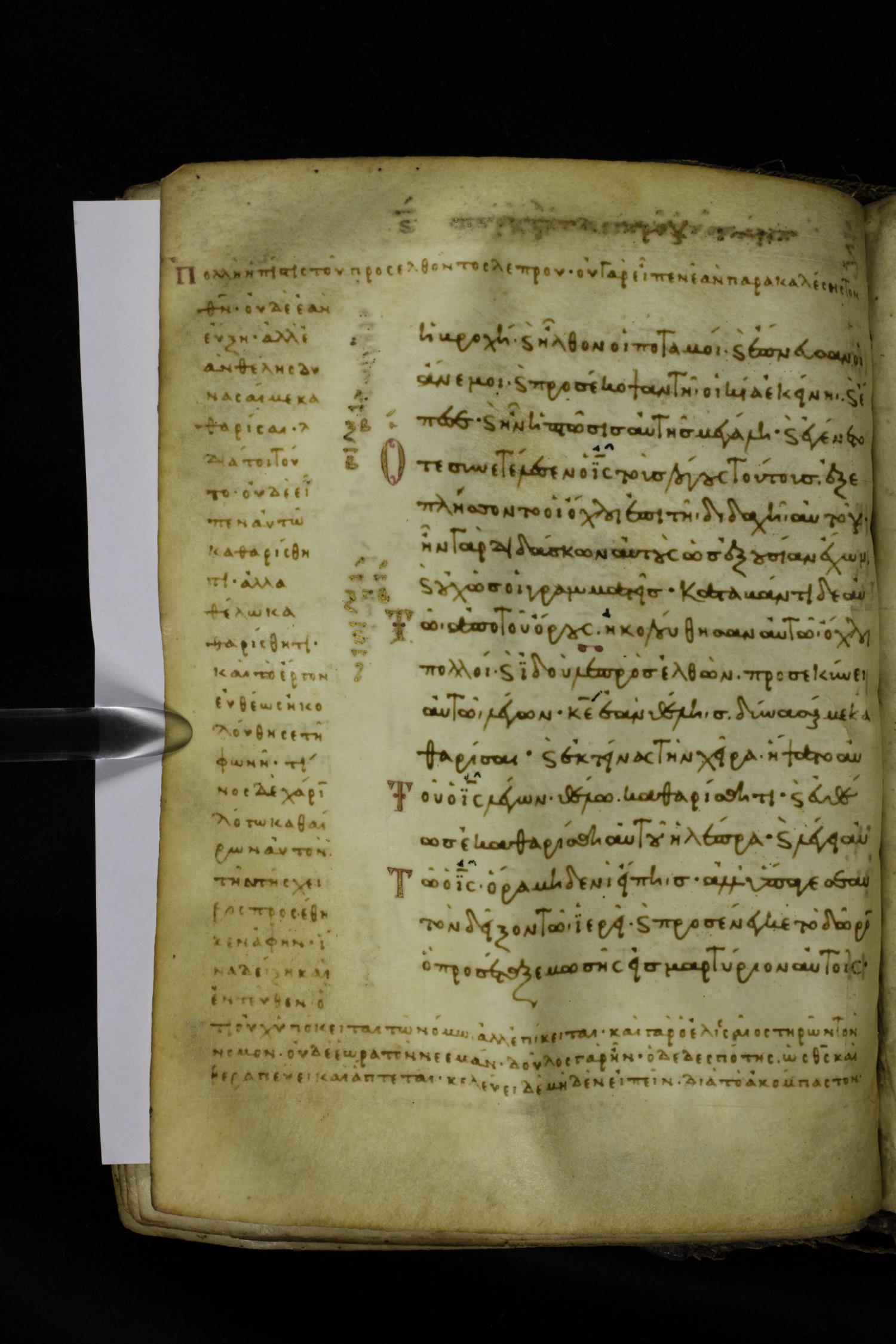 Eleventh century minuscule of the Gospels with commentary on parchment; 289 leaves, single column, 15-17 lines per column. Images were taken at the Hellenic Parliament Library in Athens.