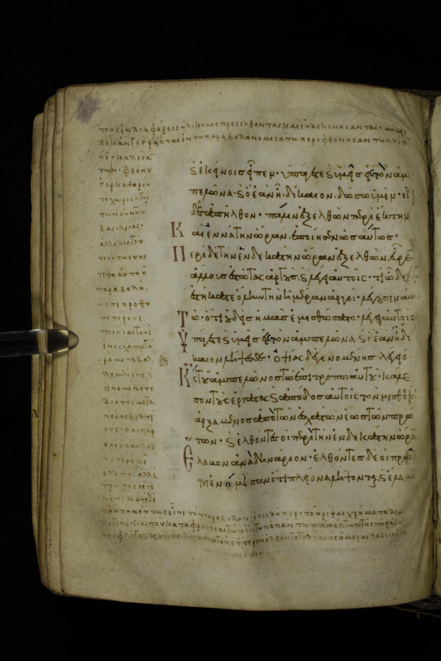 Eleventh century minuscule of the Gospels with commentary on parchment; 289 leaves, single column, 15-17 lines per column. Images were taken at the Hellenic Parliament Library in Athens.