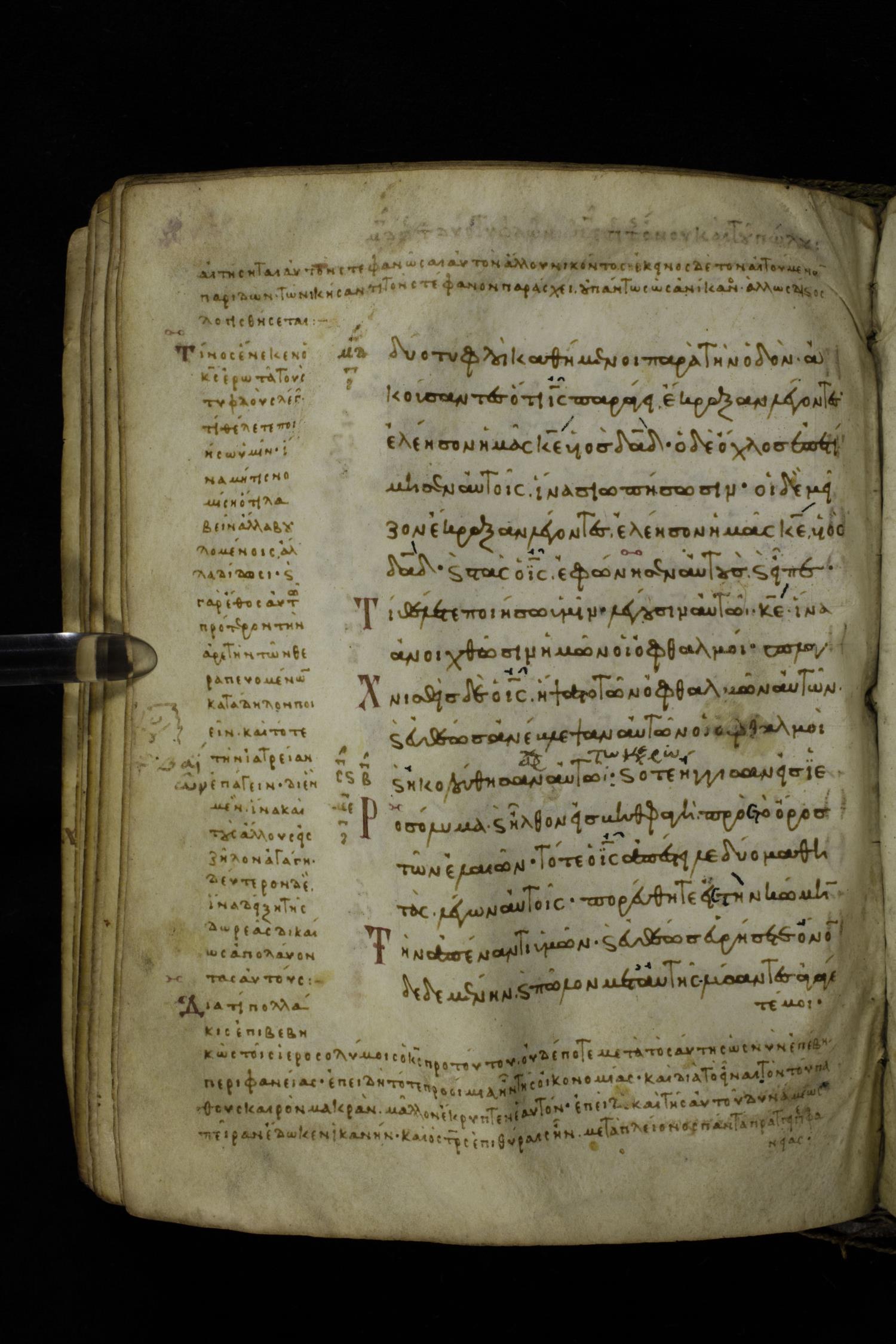 Eleventh century minuscule of the Gospels with commentary on parchment; 289 leaves, single column, 15-17 lines per column. Images were taken at the Hellenic Parliament Library in Athens.