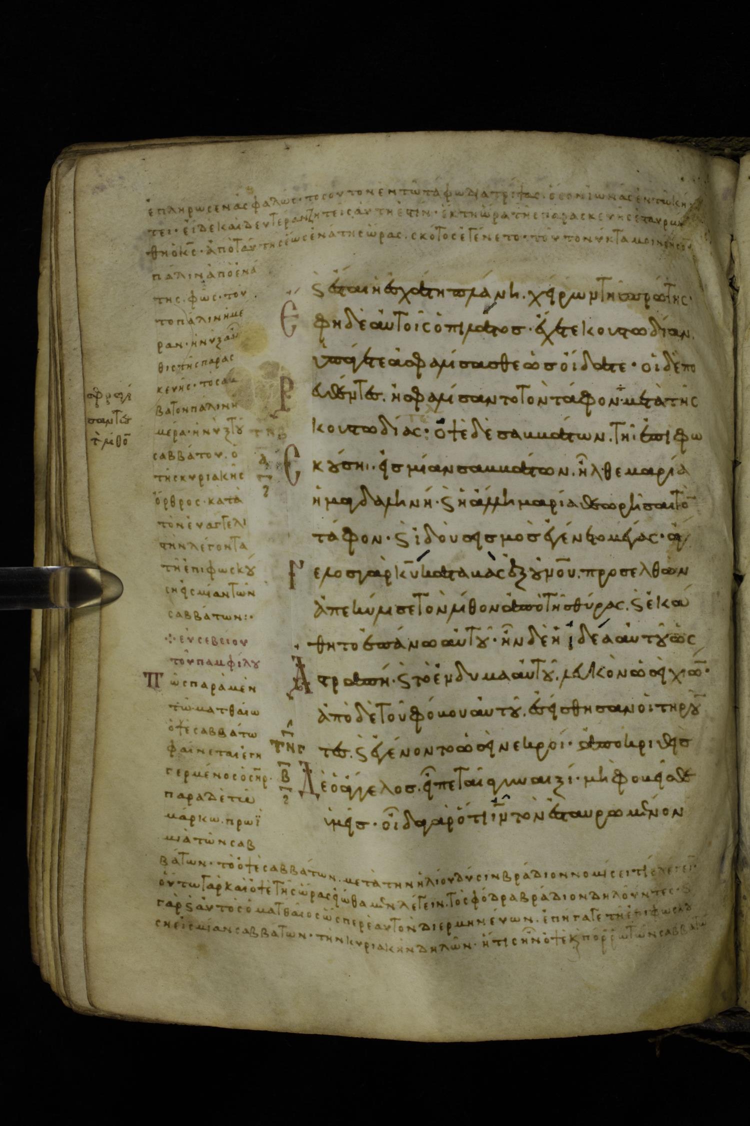 Eleventh century minuscule of the Gospels with commentary on parchment; 289 leaves, single column, 15-17 lines per column. Images were taken at the Hellenic Parliament Library in Athens.