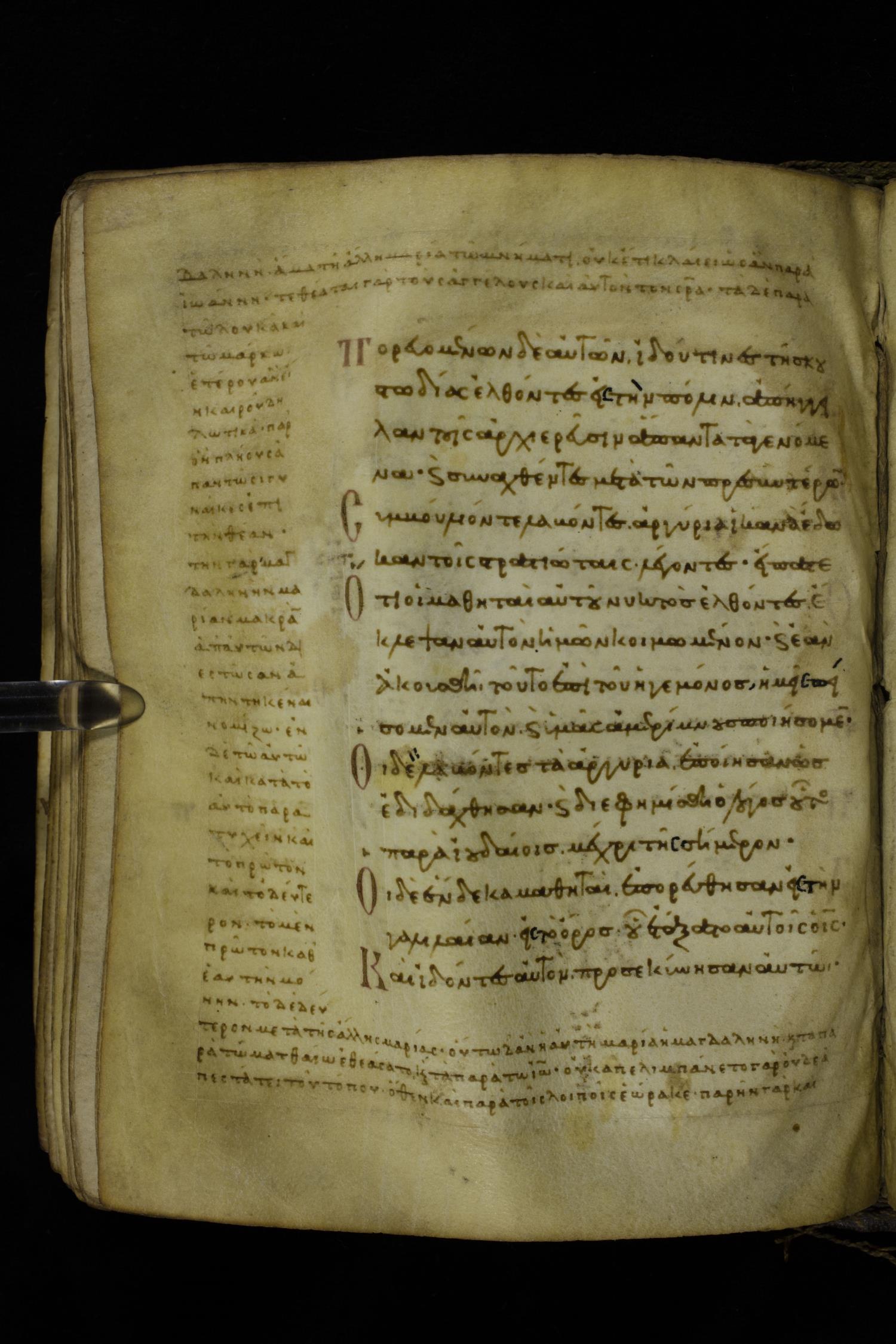 Eleventh century minuscule of the Gospels with commentary on parchment; 289 leaves, single column, 15-17 lines per column. Images were taken at the Hellenic Parliament Library in Athens.