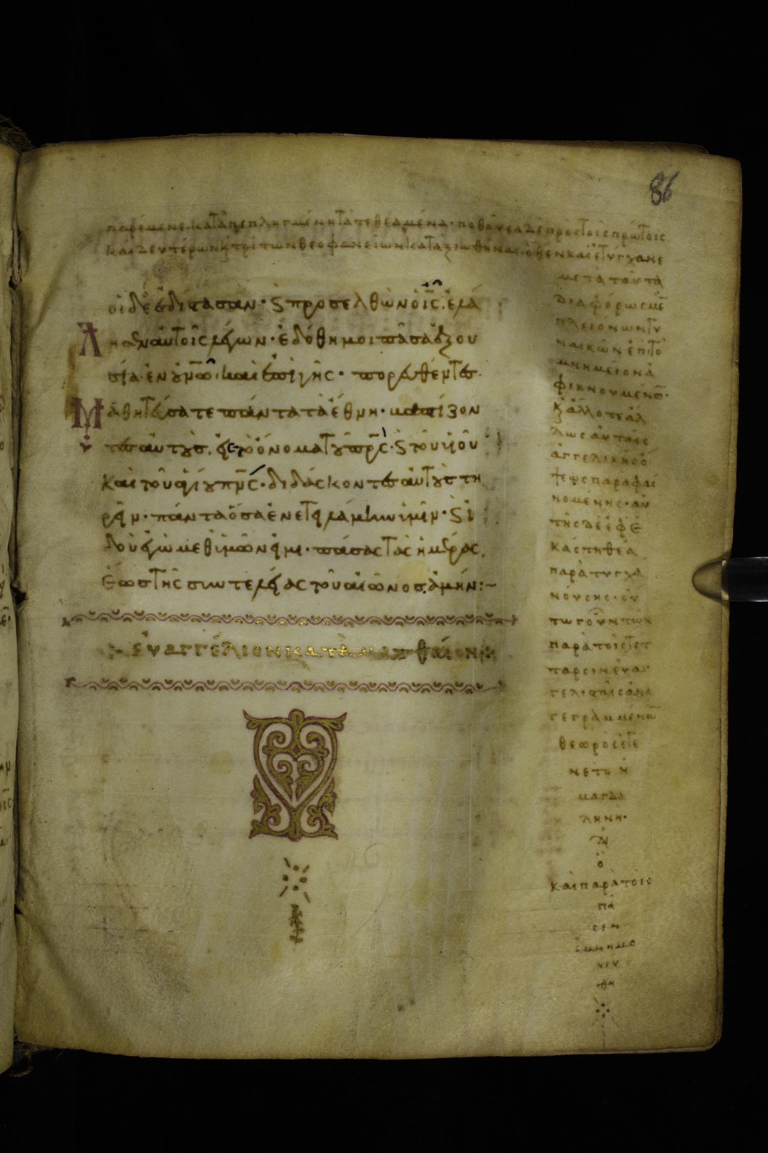 Eleventh century minuscule of the Gospels with commentary on parchment; 289 leaves, single column, 15-17 lines per column. Images were taken at the Hellenic Parliament Library in Athens.