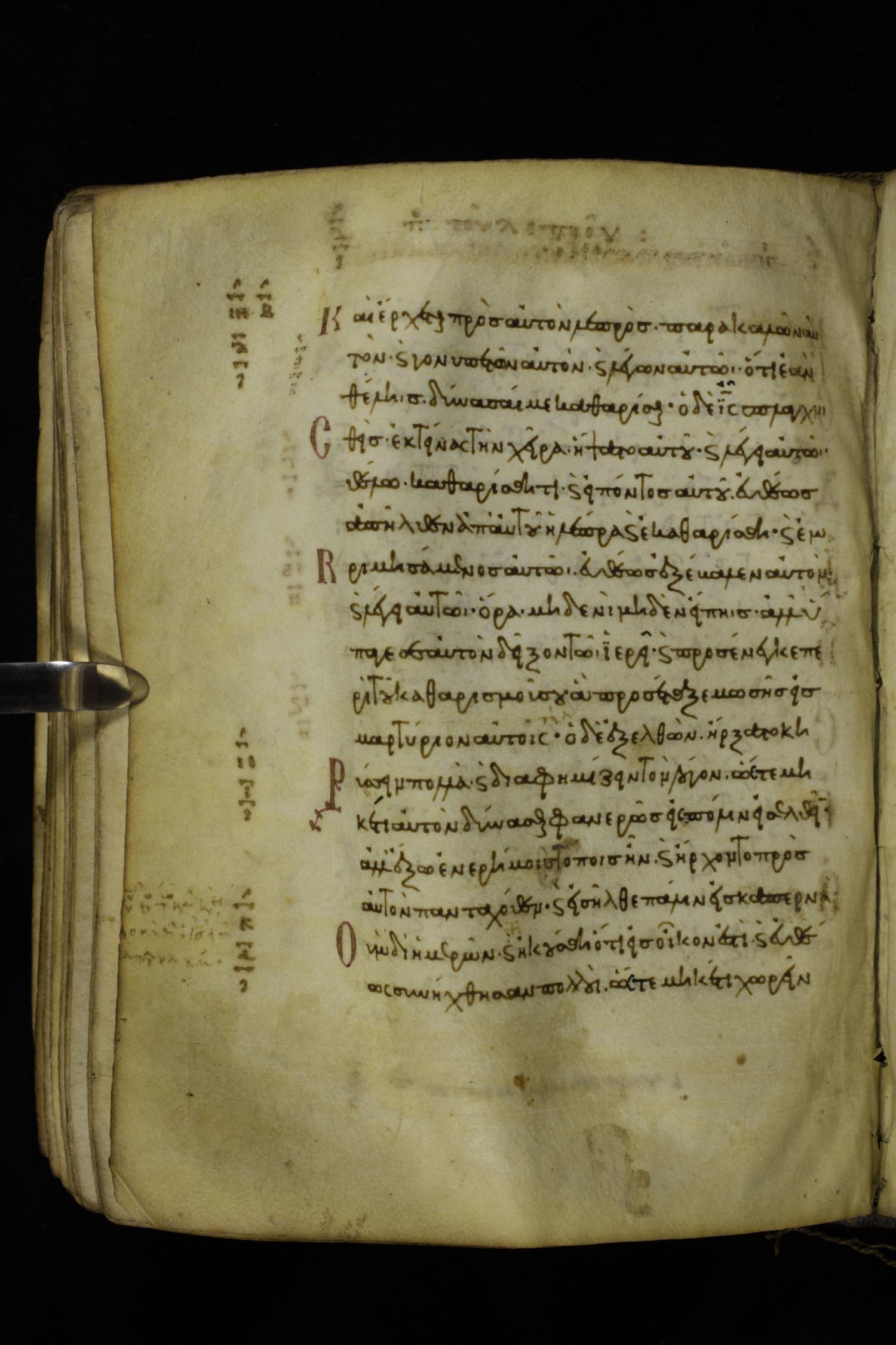 Eleventh century minuscule of the Gospels with commentary on parchment; 289 leaves, single column, 15-17 lines per column. Images were taken at the Hellenic Parliament Library in Athens.