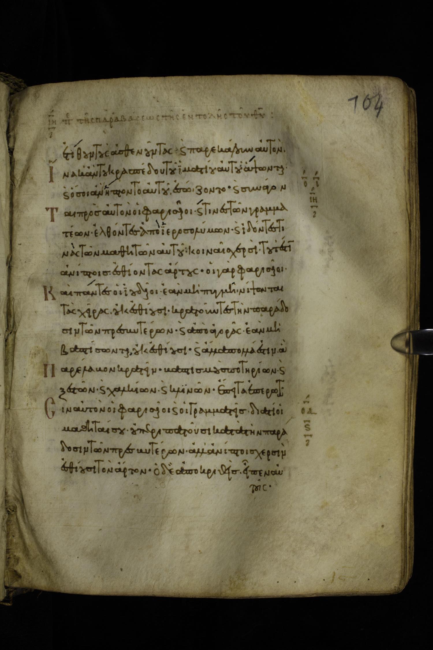 Eleventh century minuscule of the Gospels with commentary on parchment; 289 leaves, single column, 15-17 lines per column. Images were taken at the Hellenic Parliament Library in Athens.