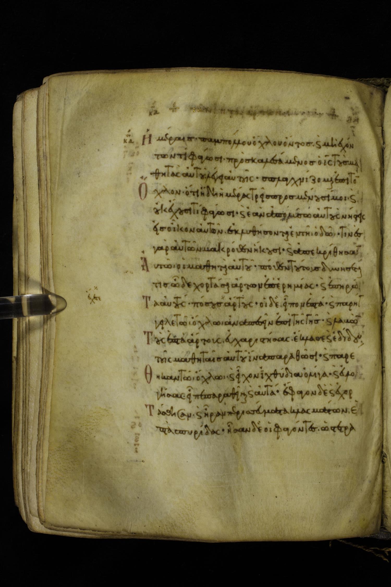 Eleventh century minuscule of the Gospels with commentary on parchment; 289 leaves, single column, 15-17 lines per column. Images were taken at the Hellenic Parliament Library in Athens.