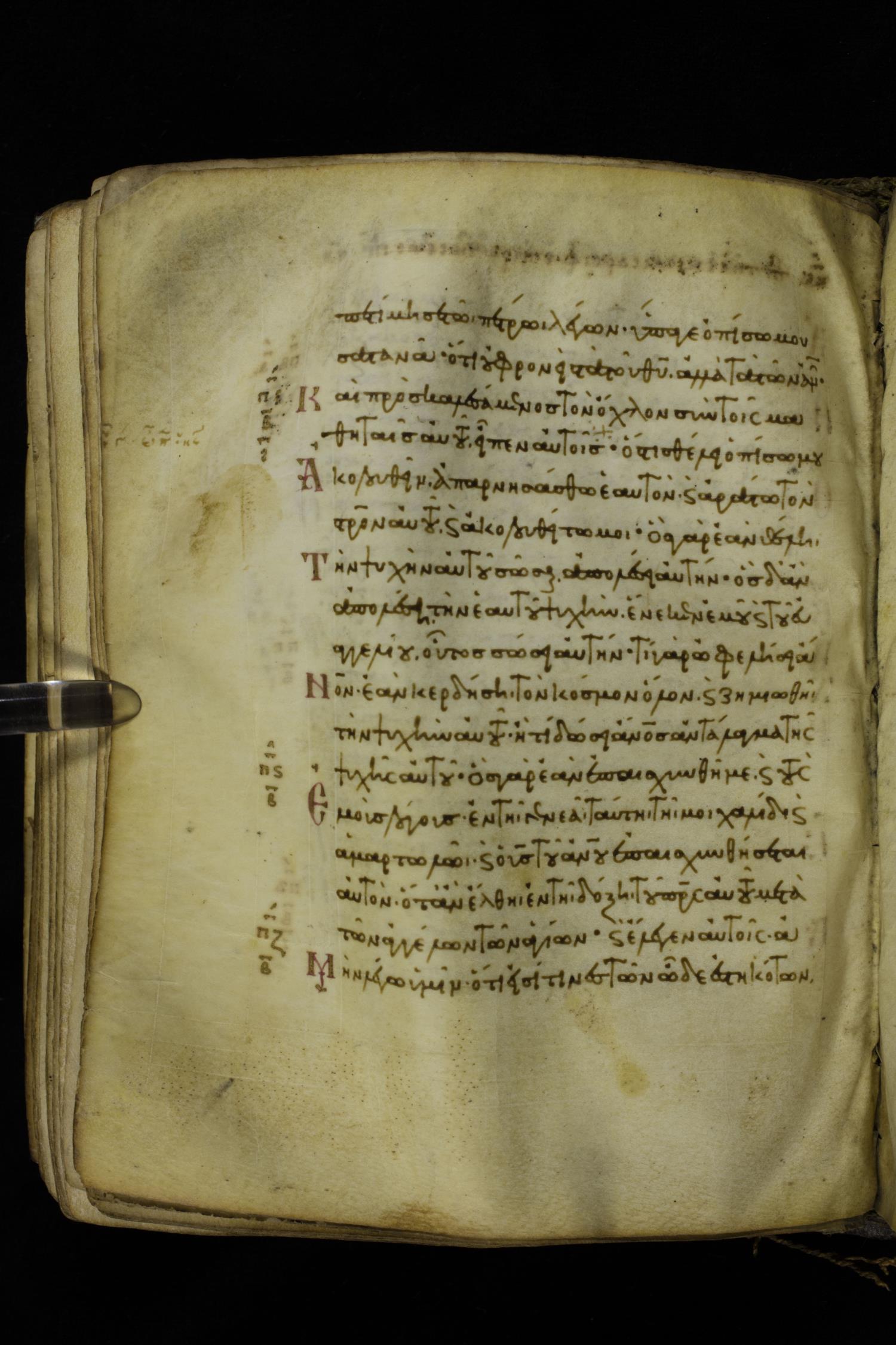 Eleventh century minuscule of the Gospels with commentary on parchment; 289 leaves, single column, 15-17 lines per column. Images were taken at the Hellenic Parliament Library in Athens.