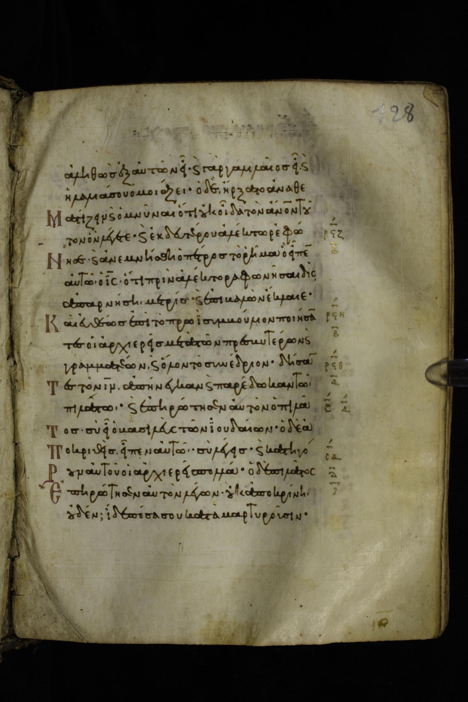 Eleventh century minuscule of the Gospels with commentary on parchment; 289 leaves, single column, 15-17 lines per column. Images were taken at the Hellenic Parliament Library in Athens.