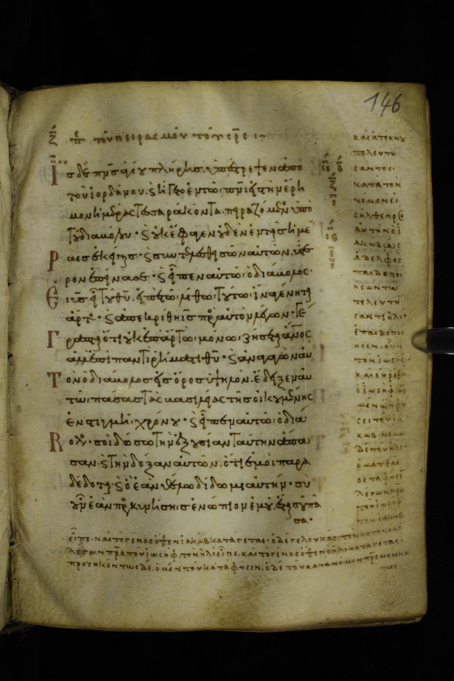 Eleventh century minuscule of the Gospels with commentary on parchment; 289 leaves, single column, 15-17 lines per column. Images were taken at the Hellenic Parliament Library in Athens.
