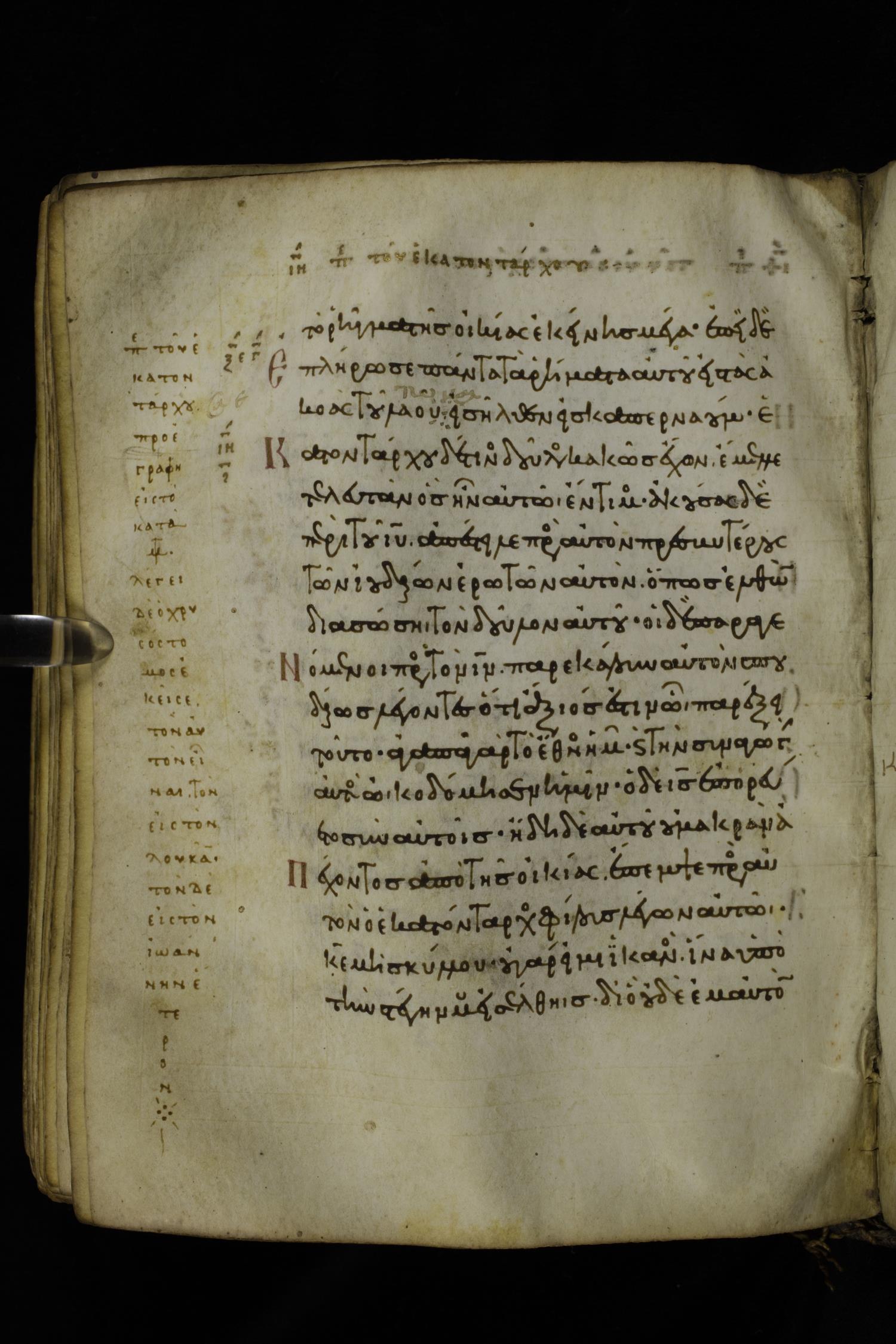 Eleventh century minuscule of the Gospels with commentary on parchment; 289 leaves, single column, 15-17 lines per column. Images were taken at the Hellenic Parliament Library in Athens.