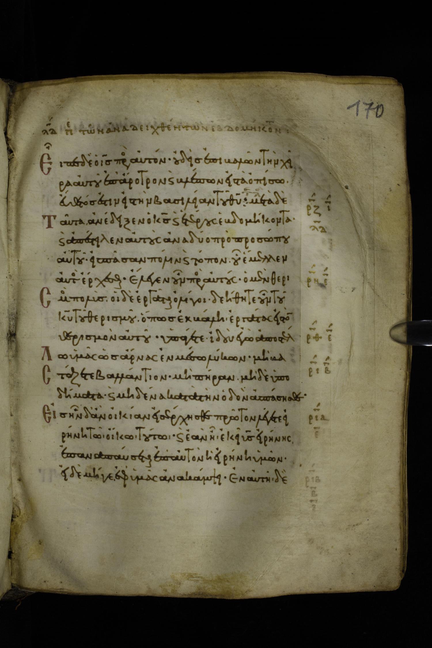 Eleventh century minuscule of the Gospels with commentary on parchment; 289 leaves, single column, 15-17 lines per column. Images were taken at the Hellenic Parliament Library in Athens.