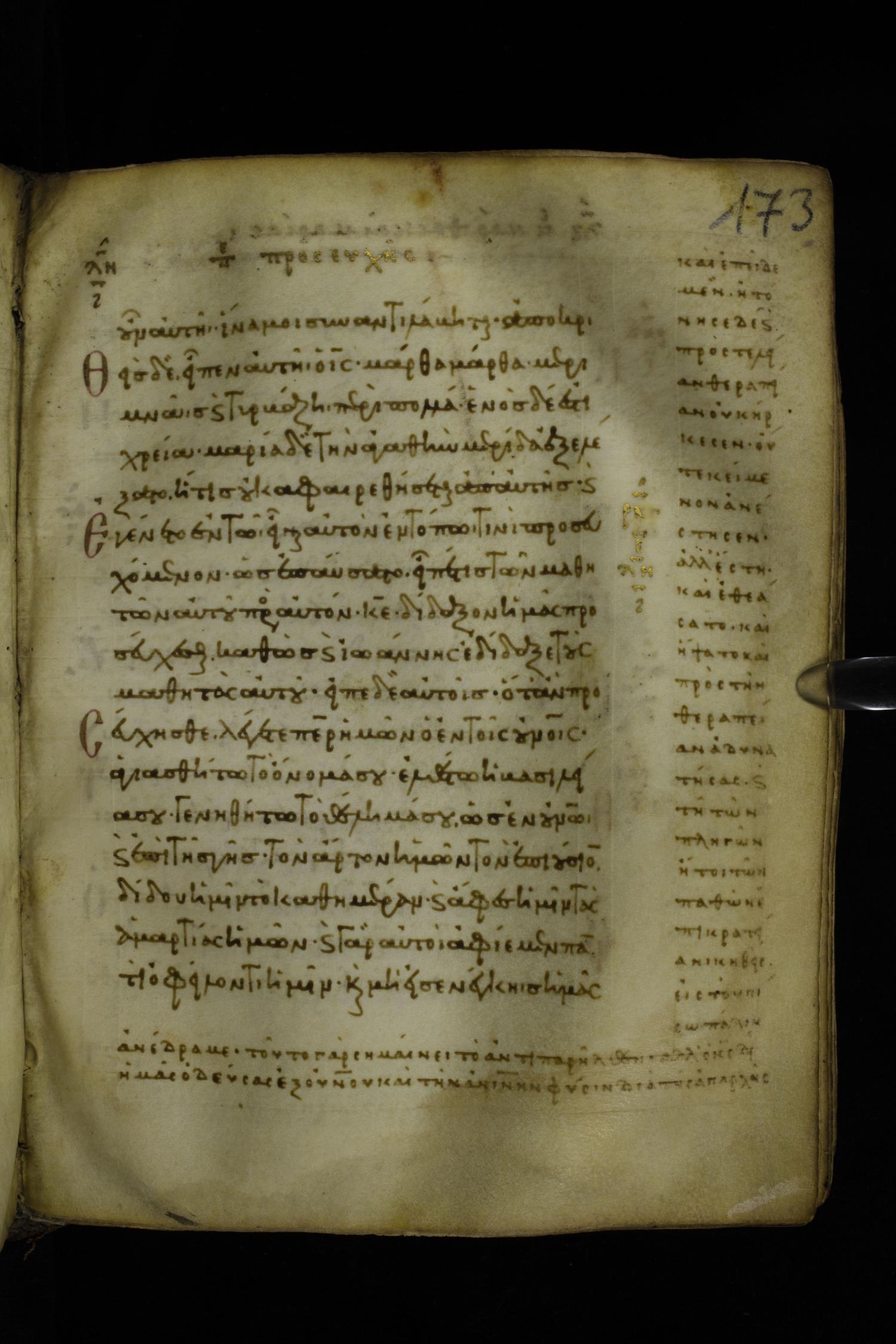Eleventh century minuscule of the Gospels with commentary on parchment; 289 leaves, single column, 15-17 lines per column. Images were taken at the Hellenic Parliament Library in Athens.
