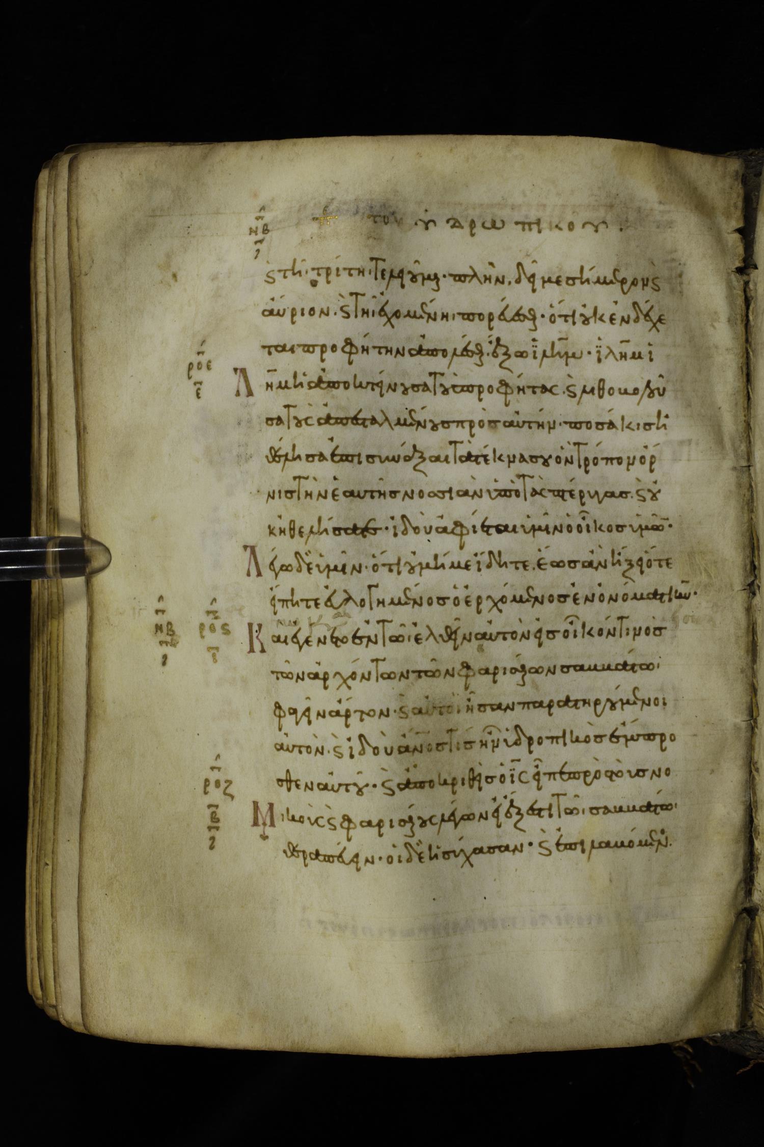 Eleventh century minuscule of the Gospels with commentary on parchment; 289 leaves, single column, 15-17 lines per column. Images were taken at the Hellenic Parliament Library in Athens.